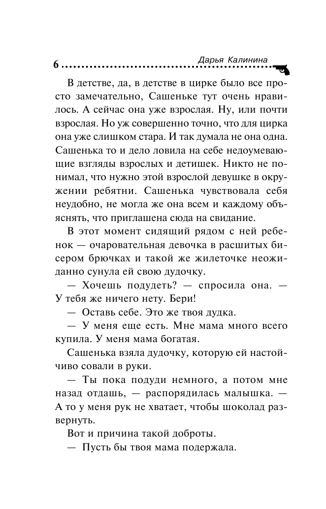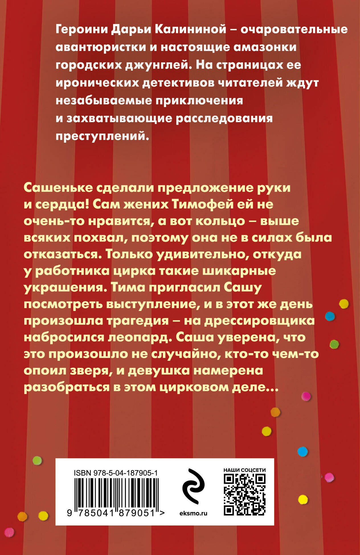 Сашеньке сделали предложение руки и сердца! Сам жених Тимофей ей не очень-то нравится, а вот кольцо - выше всяких похвал, поэтому она не в силах была отказаться. Только удивительно, откуда у работника цирка такие шикарные украшения. Тима пригласил Сашу посмотреть выступление, и в этот же день произошла трагедия - на дрессировщика набросился леопард. Саша уверена, что это произошло не случайно, кто-то чем-то опоил зверя, и девушка намерена разобраться в этом цирковом деле. Сможет ли девушка найти преступника, издевающегося над цирковыми животными и работниками, и кто стоит за странными происшествиями на арене - обо всем этом читайте в новом ироническом детективе Дарьи Калининой.