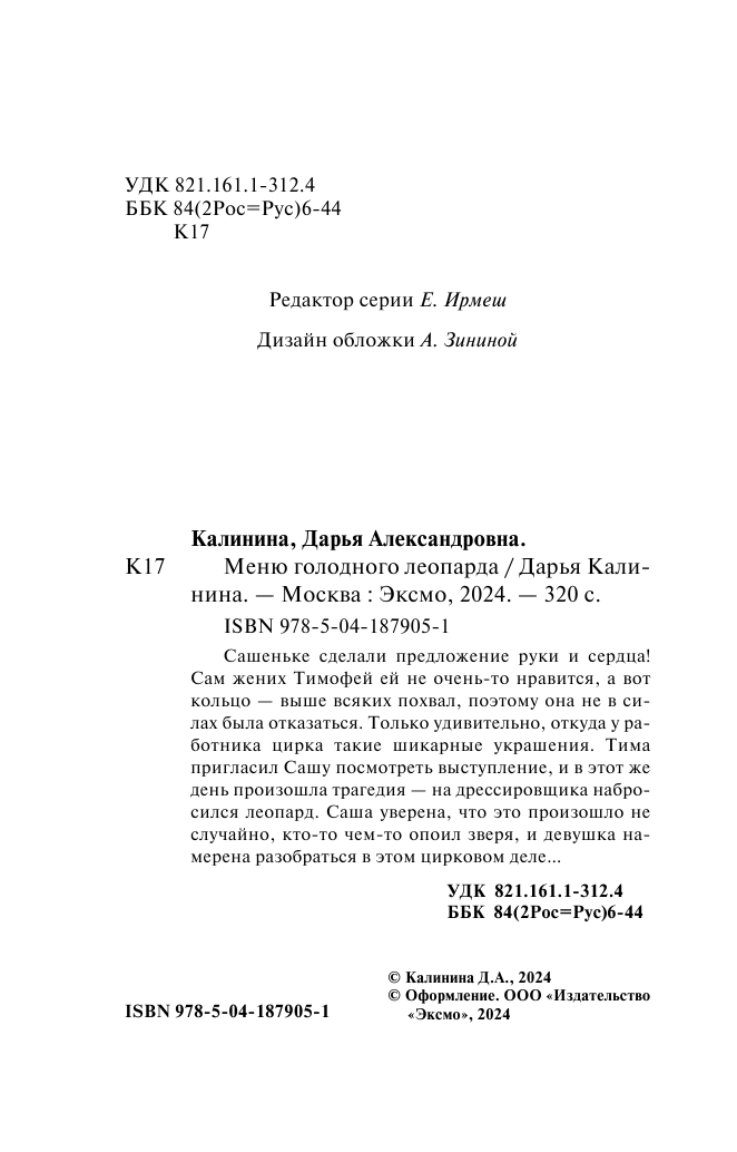 Книга: Меню голодного леопарда (Дарья Александровна Калинина); Эксмо, 2024