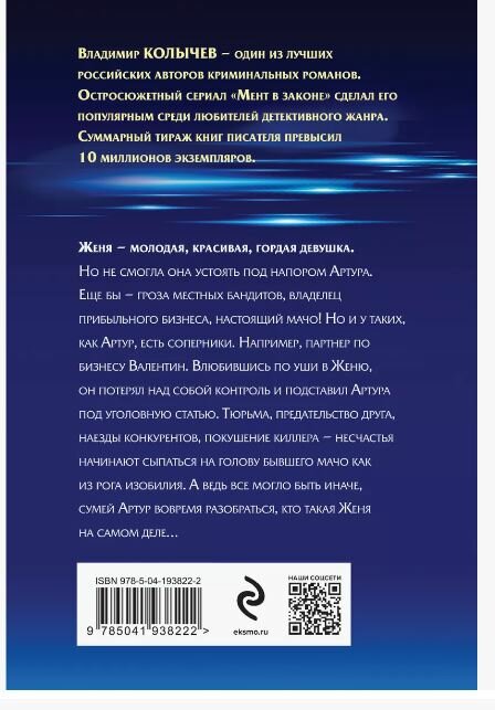 Женя - молодая, красивая, гордая девушка. Но не смогла она устоять под напором Артура. Еще бы - гроза местных бандитов, владелец прибыльного бизнеса, настоящий мачо! Но и у таких, как Артур, есть соперники. Например, партнер по бизнесу Валентин. Влюбившись по уши в Женю, он потерял над собой контроль и подставил Артура под уголовную статью. Тюрьма, предательство друга, наезды конкурентов, покушение киллера - несчастья начинают сыпаться на голову бывшего мачо как из рога изобилия. А ведь все могло быть иначе, сумей Артур вовремя разобраться, кто такая Женя на самом деле.