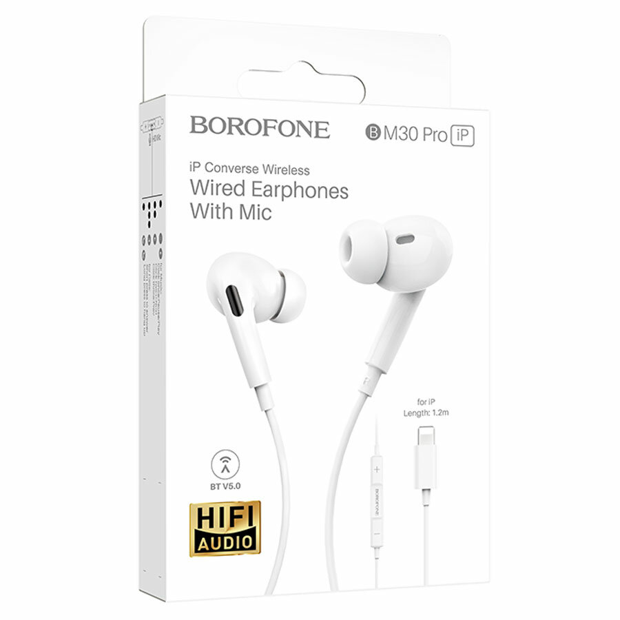 Вакуумные наушники Lightning Borofone BM30 Pro отличаются качественной фиксацией устройства в ухе. Они хорошо воспроизводят разные частоты и поглощают шумы, поэтому с ними удобно слушать музыку даже в метро или в поезде. Данная модель выполнена в аккуратном дизайне, оснащена микрофоном с отличной передачей речи и кнопками приема вызова и регулировки воспроизведения, можно легко переключатся между прослушиванием музыки и звонками. Имеет разъем Lightning и совместима с большим количеством устройств компании Apple. Возможно необходимая синхронизация по Bluetooth V 5.0. Характеристики: • Бренд - Borofone • Конструкция - внутриканальные • Микрофон - есть • Ответить/закончить разговор - есть • Разъем - Lightning • Длина кабеля - 1.2 м