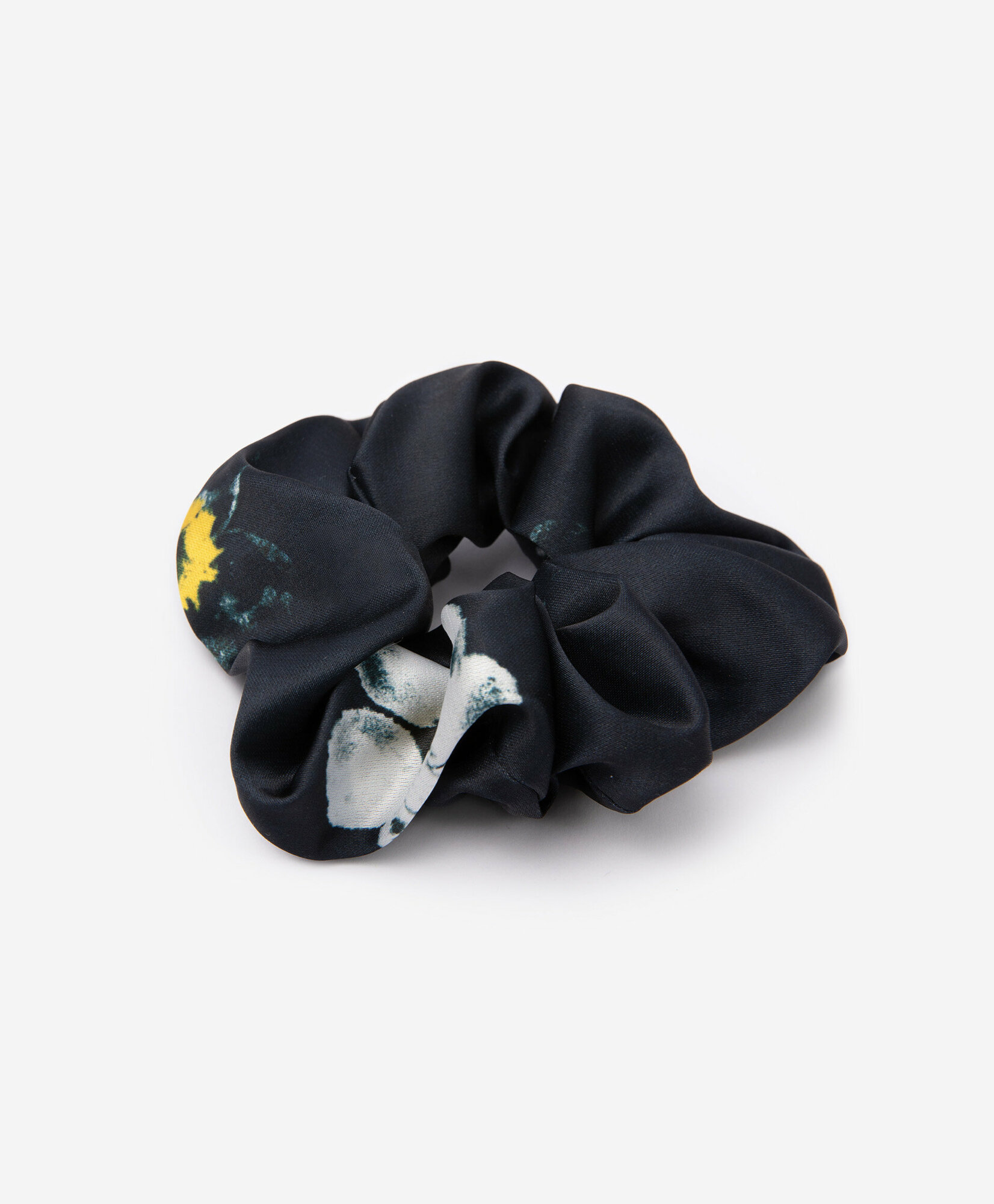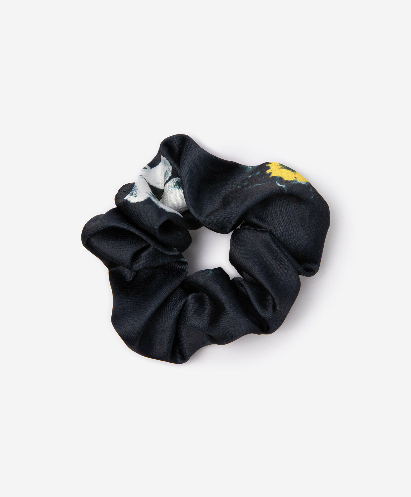 Резинка с драпированным цветным текстилем, создающим объем, сделает прическу красивой и завершенной.
