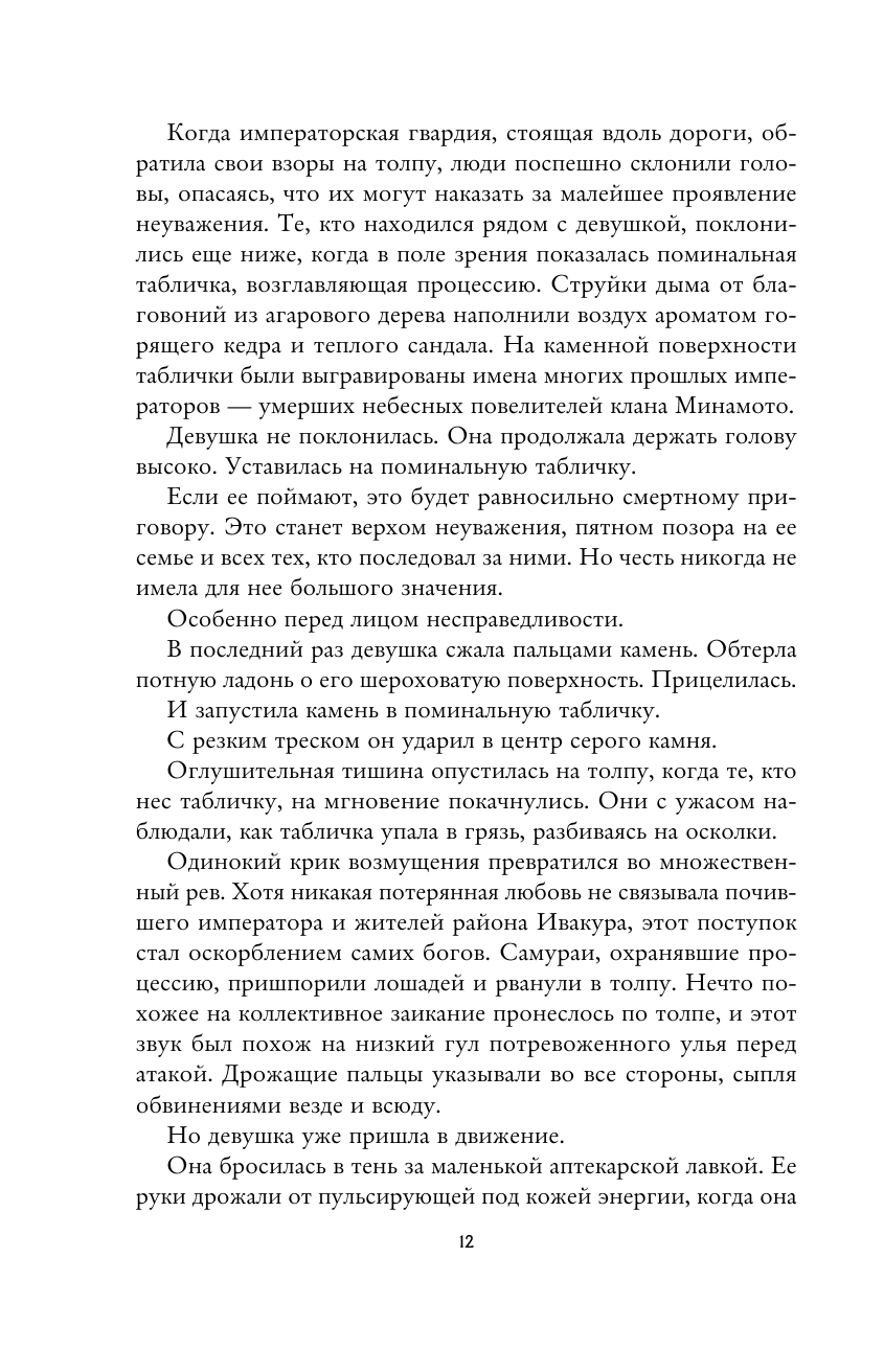 Бестселлер The New York Times! Продолжение романа «Пламя в тумане». Завораживающее азиатское фэнтези о самопожертвовании, чести, любви и семейных ценностях. Как будто «Мулан» встречается с «Игрой престолов». От автора мировых бестселлеров «Красавица» и «Ярость и рассвет». Марико Хаттори вернулась в императорский дворец. Она должна узнать правду о том, кто замышлял ее убить и почему хотел взвалить вину на Черный клан. А для этого ей придется заставить своего жениха, принца Райдэна, поверить ей. Но в этой хитроумной игре Марико не сможет действовать так, как привыкла. Теперь она будет вооружена только умом и хитростью. И пока она будет играть свою роль, ей предстоит найти способ спасти приговоренного к смерти Оками, юношу, укравшего ее сердце. Смогут ли они снова быть вместе? «Алхимия, самураи и Рене Ахдие. Разве нужно что-то еще говорить? » - Culturess «Если вам понравилась диснеевская "Мулан", то вы полюбите эту книгу». - The Newark Advocate Об авторе Рене Ахдие - американо-корейская писательница, наиболее известная своим бестселлером «Ярость и рассвет». Этот роман переведен на 18 языков. Журнал TIME включил его в список «100 лучших фэнтези-книг всех времен и народов».