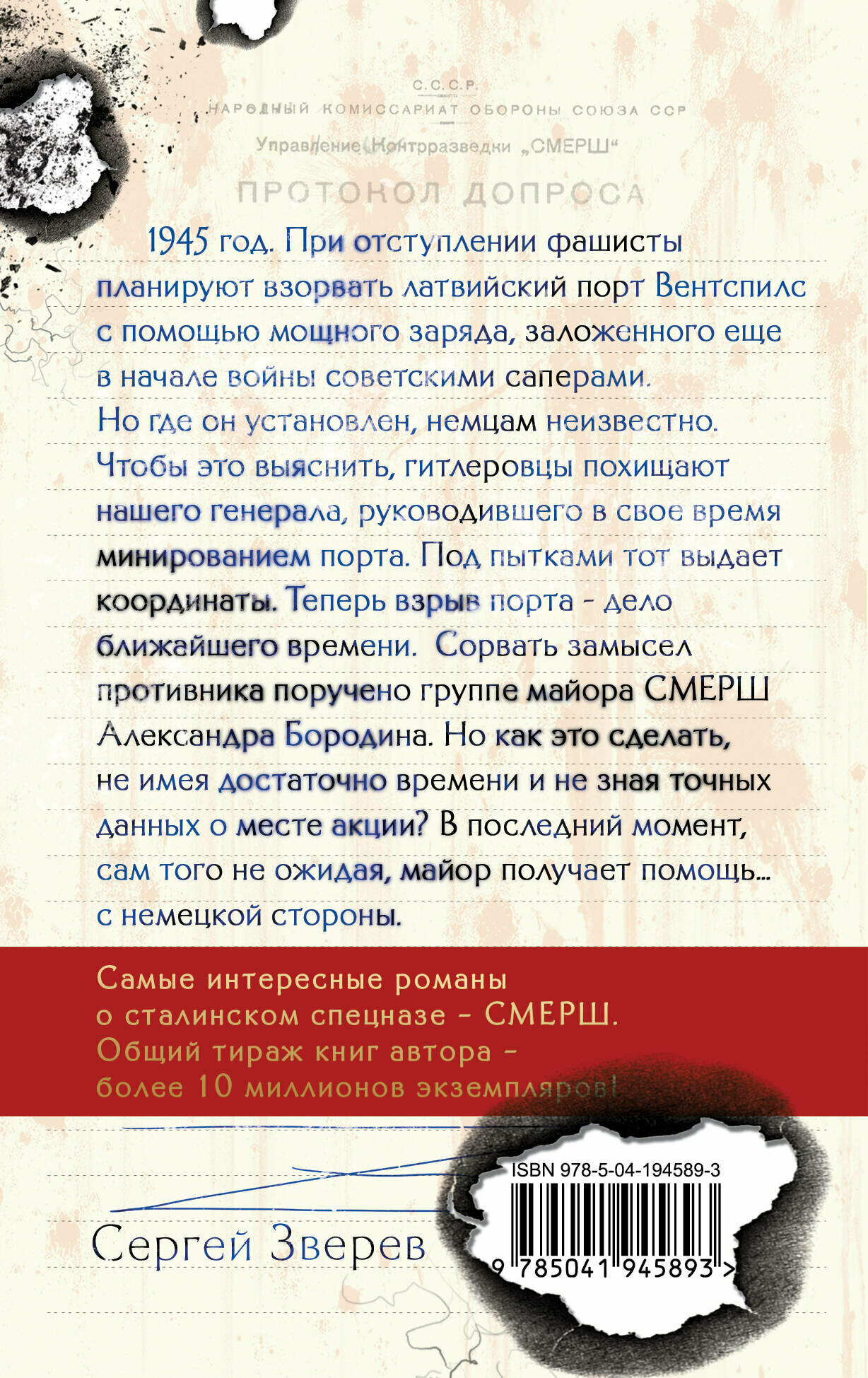 Самые интересные романы о сталинском спецназе - СМЕРШе. 1945 год. При отступлении фашисты планируют взорвать латвийский порт Вентспилс с помощью мощного заряда, заложенного еще в начале войны советскими саперами. Но где он установлен, немцам неизвестно. Чтобы это выяснить, гитлеровцы похищают нашего генерала, руководившего в свое время минированием порта. Под пытками тот выдает координаты. Теперь взрыв порта - дело ближайшего времени. Сорвать замысел противника поручено группе майора СМЕРШа Александра Бородина. Но как это сделать, не имея достаточно времени и не зная точных данных о месте акции? В последний момент, сам того не ожидая, майор получает помощь. с немецкой стороны. «Смерть шпионам! » (СМЕРШ) - это короткое и беспощадное название носило особое подразделение НКВД, подчинявшееся И. Сталину. Созданное в годы войны, оно состояло из проверенных в бою, честных и бесстрашных офицеров Красной Армии. СМЕРШа боялись все - и фашистские лазутчики, готовящие диверсии в наших боевых порядках, и гитлеровские приспешники, действующие в глубоком советском тылу. Враг знал: если на его след напали бойцы сталинского спецназа, справедливого и скорого суда не избежать. Романы серии «СМЕРШ - спецназ Сталина» - это каждый раз увлекательный динамичный сюжет и новые исторические знания, это экшен, написанный простым и понятным языком. Общий тираж книг А. Тамоникова - более 10 миллионов экземпляров!