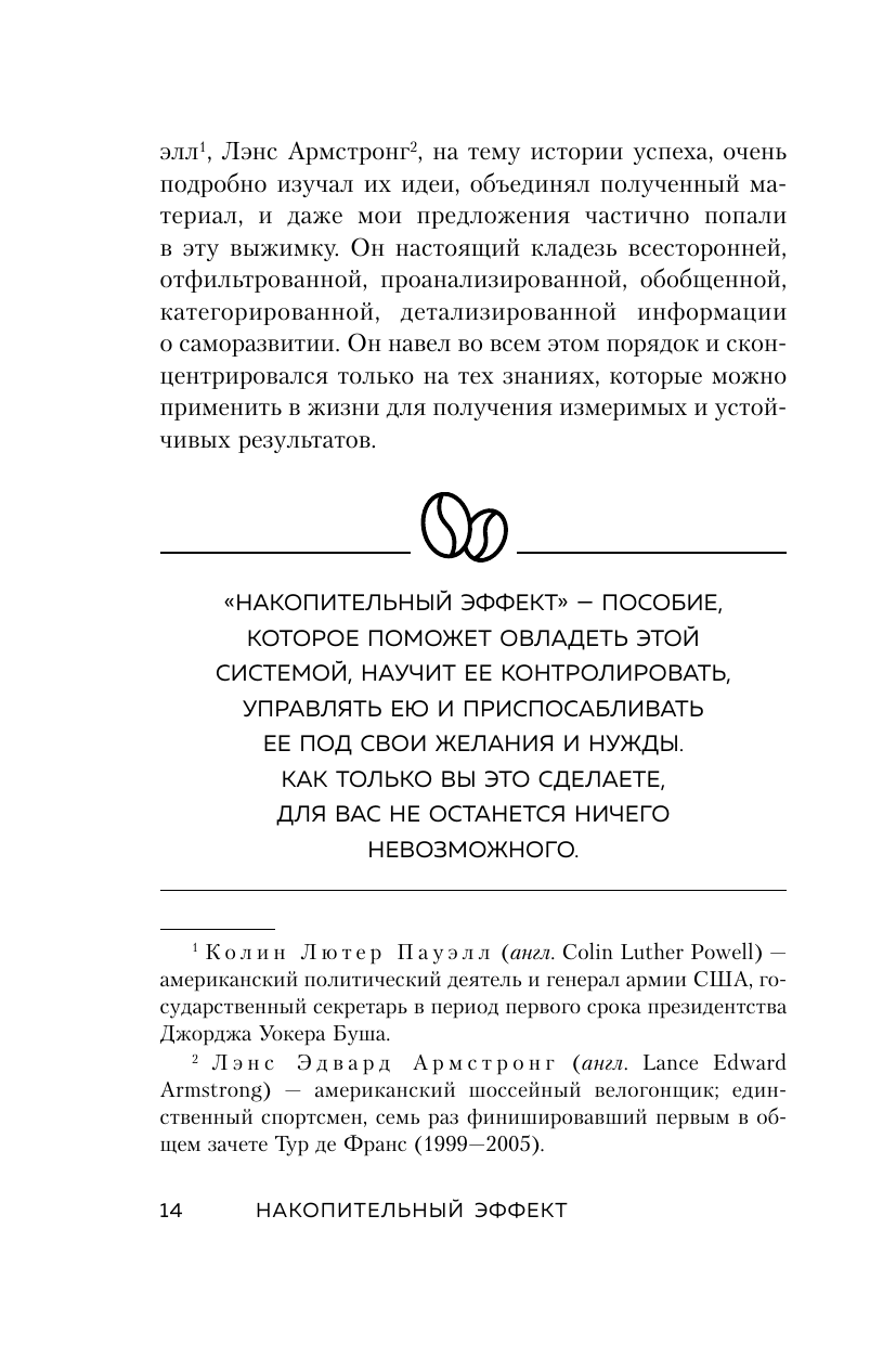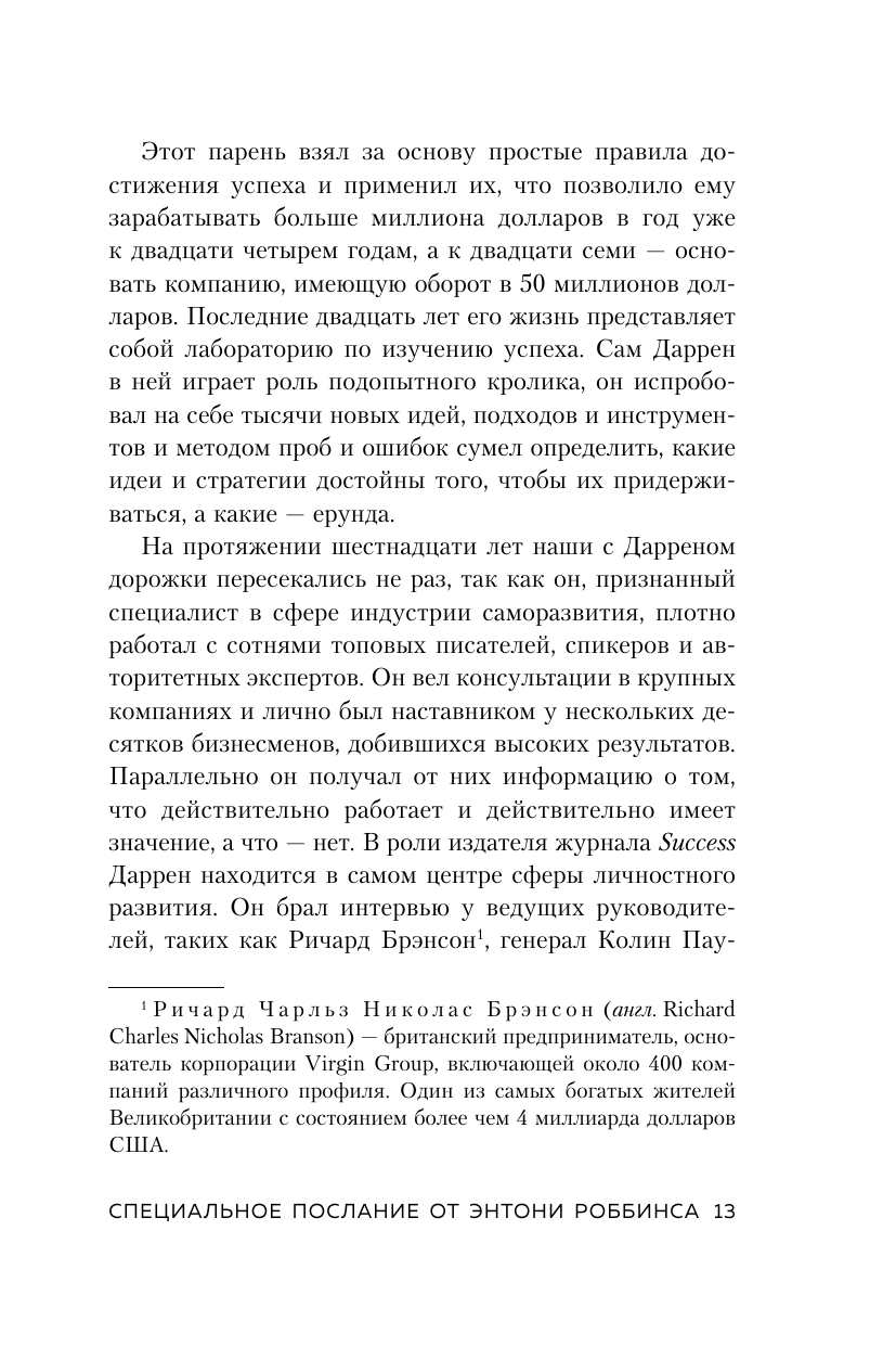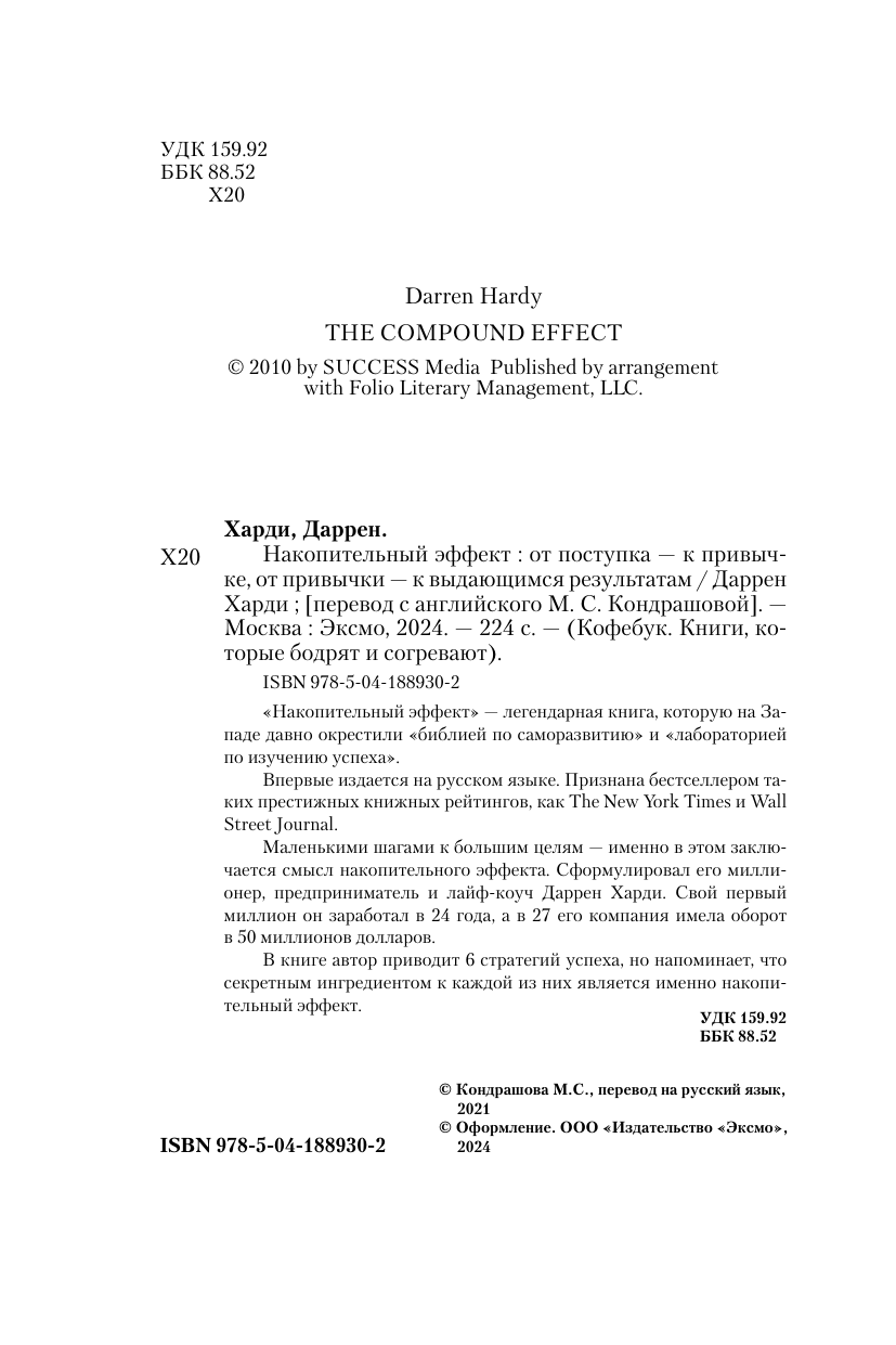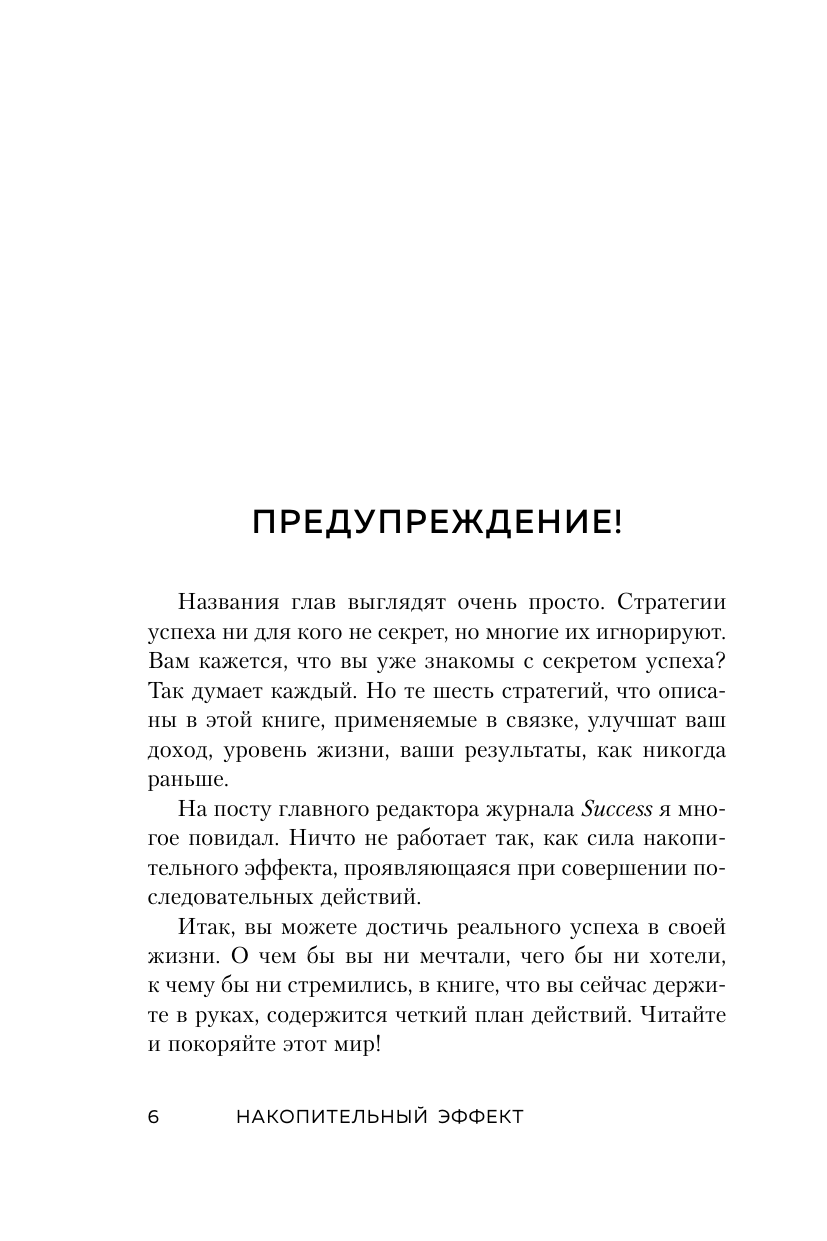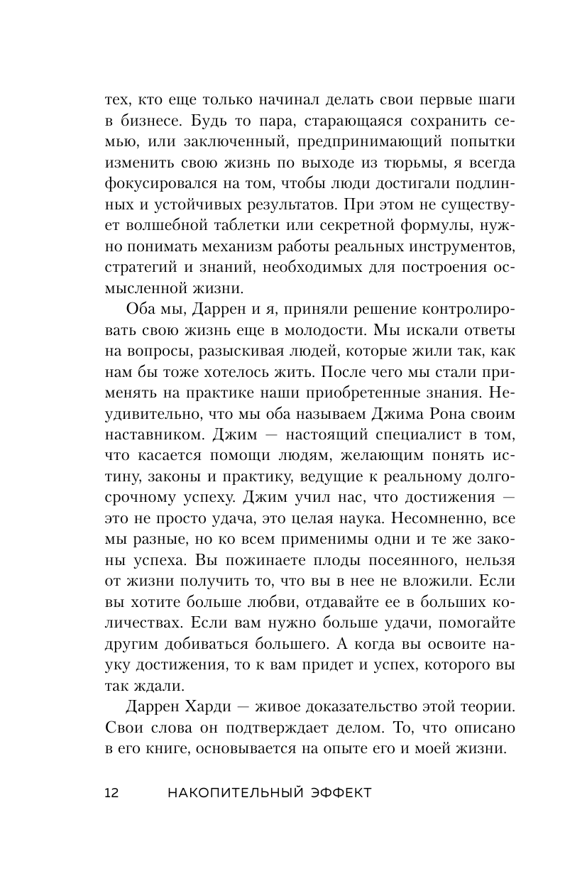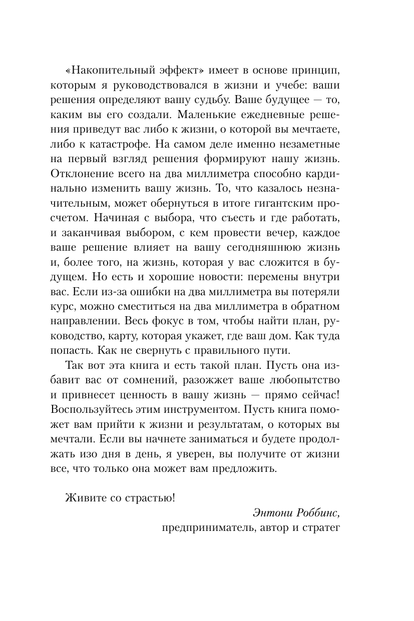 Мы все тайно мечтаем о золотом ключике, который бы отпер дверь с надписью «успех». Мало того, мы надеемся, что ключик этот каким-то чудом однажды окажется в нашем кармане. И все, что нам останется - легко провернуть его в замочной скважине, и на нас посыпется долгожданные признание, слава, богатство и процветание. Существует ли на самом деле этот ключик? Да. Но он отнюдь не золотой. Это самый обычный, потертый ключ. И он всегда с нами. Имя ему - выбор. Каждый день мы проворачиваем его несколько сотен раз в замочной скважине собственной жизни. Сотни крошечных решений приближают нас к успеху. Или, наоборот, отдаляют от него. Накопительный эффект - это система, в основе которой как раз и лежат ежедневные осознанные решения. Именно с помощью этих маленьких ключиков мы способны отпереть нужную дверь и войти в жизнь мечты. Почему эта книга достойна прочтения «Накопительный эффект» - легендарная книга, которую на Западе давно окрестили «библией по саморазвитию» и «лабораторией по изучению успеха». Впервые издается на русском языке. Признана бестселлером таких престижных книжных рейтингов, как The New York Times и Wall Street Journal. Об авторе Сформулировал принцип накопительного эффекта миллионер, предприниматель и коуч Даррен Харди. Свой первый миллион он заработал в 24 года, а в 27 его компания имела оборот в 50 миллионов долларов. Отзывы «Через тернии к звездам» - не просто знаменитая фраза, но и прекрасное напоминание о том, что к успеху можно прийти, только если шаг за шагом идти к своей цели. Даррен Харди в «Накопительном эффекте» учит делать это по-настоящему продуманно и системно! » - Ульяна Петрухина, ulielie/улилай, книжный видеоблогер