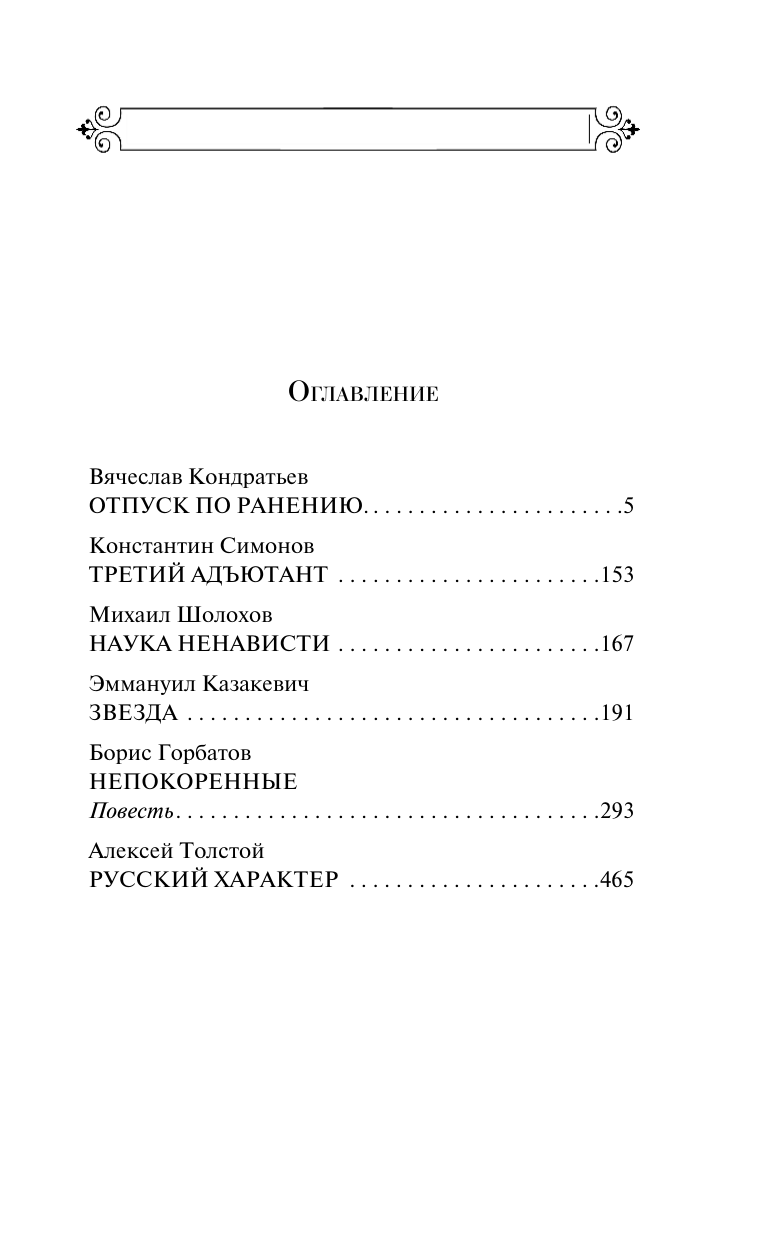 В сборник вошли рассказы советских писателей-фронтовиков и военных корреспондентов, которые повествуют о силе солдатского характера. На этих страницах нашли отражение и подвиг разведчиков ("Звезда"), и чувство долга перед боевыми товарищами ("Отпуск по ранению"), и несгибаемая воля рабочих и подпольщиков на оккупированных территориях ("Непокоренные"). А истории о том, как от зверств фашистов возникала ненависть к врагу ("Наука ненависти"), смелость защищала от пули ("Третий адъютант"), а любовь родных и близких придавала сил ("Русский характер") уже давно стали классикой.