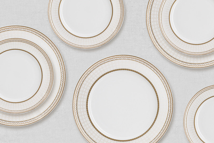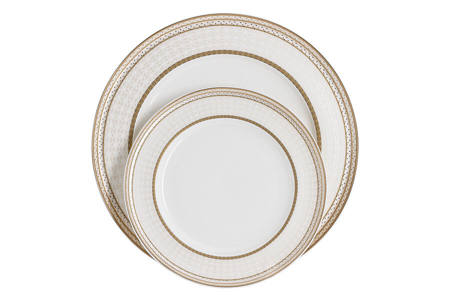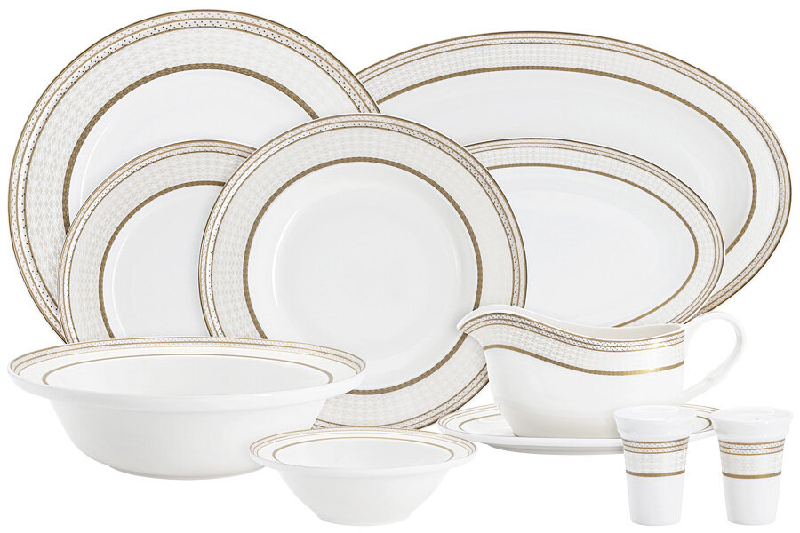 | Состав набора | 6 обеденных тарелок 27 см, 6 суповых тарелок 21,5 см, 6 закусочных тарелок 20 см, 1 салатник 23 см, 1,8 л, 2 салатника 14 см, 0,6 л, блюдо 35,5 см, блюдо 25 см, соусник 0,5 л, блюдо под соусник 21 см, солонка, перечница |