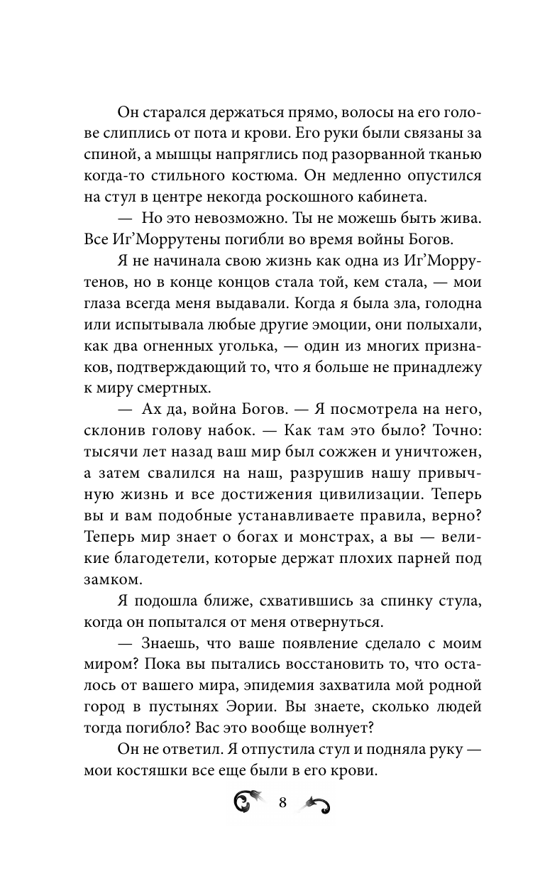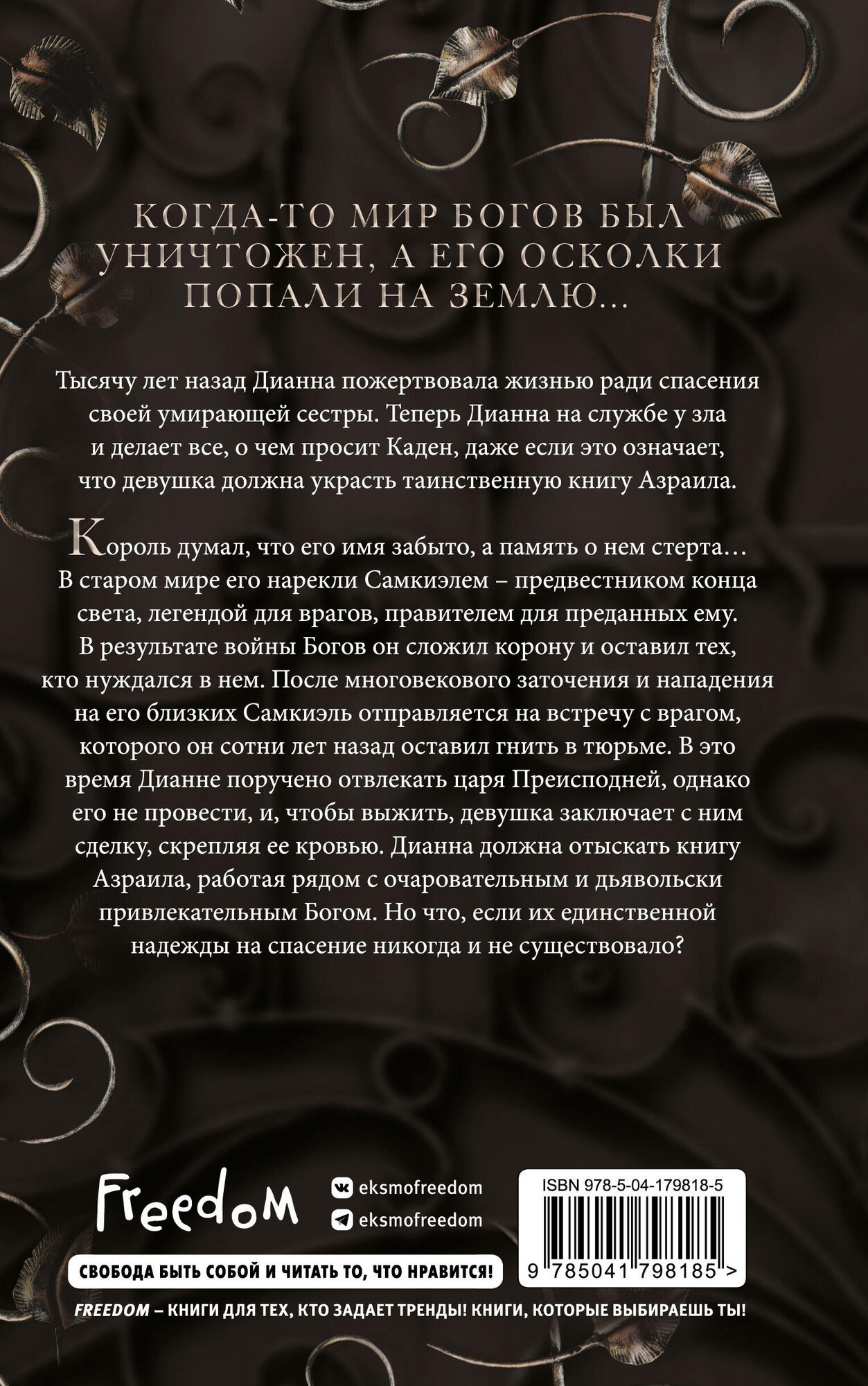 Темное фэнтези от Эмбер Николь. История, основанная на древних мифах и легендах. Дианна - безжалостная, дерзкая, сильная, несет с собой хаос и разрушения. Самаэль - мрачный, опасный, жестокий. Кто они? Когда-то мир Богов был уничтожен, а его осколки попали на Землю. Тысячу лет назад Дианна пожертвовала жизнью ради спасения своей умирающей сестры. Она взывала ко всем, кто был готов помочь, не ожидая, что призовет могущественное чудовище, которое хуже любого кошмара. Теперь Дианна на службе у зла и делает все, о чем просит Каден, даже если это означает, что девушка должна украсть таинственную книгу Азраила. Король думал, что его имя забыто, а память о нем стерта. В старом мире его нарекли Самаэлем. В новом его имя Лиам, но одно осталось неизменным - он предвестник конца света, легенда для врагов, правитель для преданных ему. После войны Богов он скрылся от мира, сложил корону и оставил тех, кто нуждался в нем больше всего, выживать на умирающей земле. После многовекового заточения и нападения на его близких Самаэль отправляется на встречу с врагом, которого он сотни лет назад оставил гнить в тюрьме. В это время Дианне поручено отвлекать царя Преисподней, однако его не провести, и, чтобы выжить, девушка заключает с ним сделку, скрепляя ее кровью. Дианна должна отыскать книгу Азраила, работая рядом с очаровательным и дьявольски привлекательным Богом. Но что, если их единственной надежды на спасение никогда и не существовало? Цитата, после которой вы захотите узнать больше: «Я не помню, как долго мы разговаривали, но где-то между ее смехом и улыбкой я решил, что ради нее я разорву этот мир на части». «Динамичное фэнтези о любви, предательстве, ненависти, власти и мести». - Goodreads