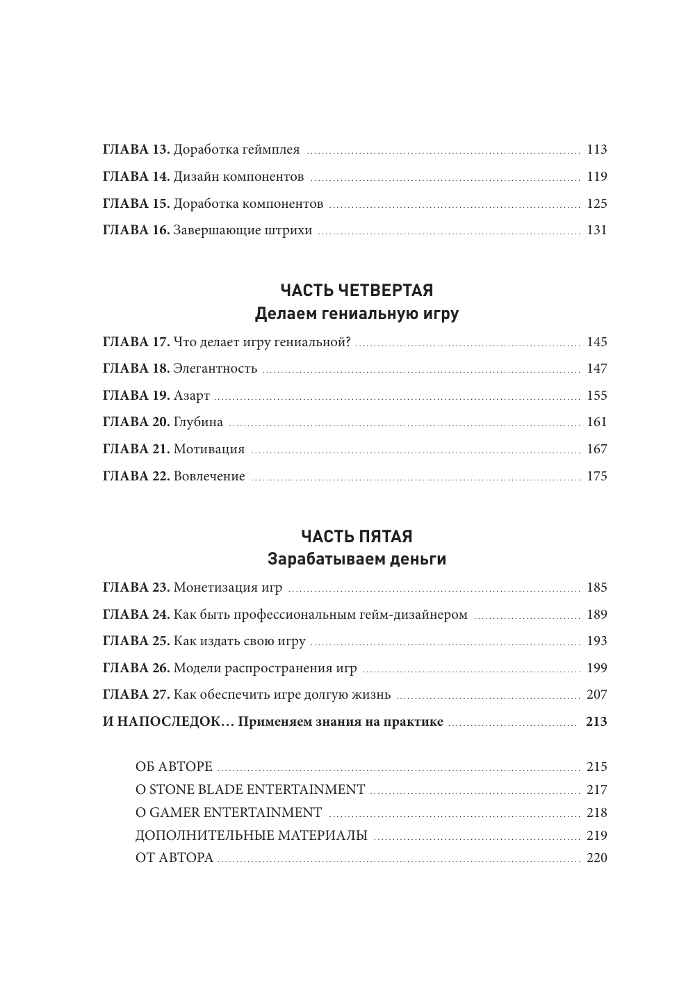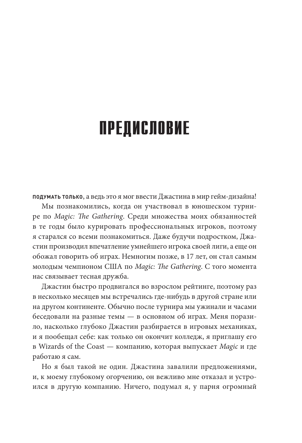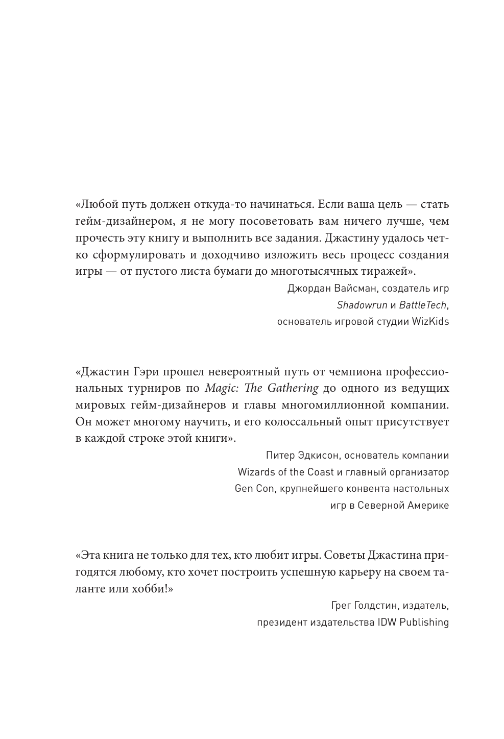 Вы любите игры и хотите научиться профессионально их создавать? Тогда эта книга идеально вам подойдет! Джастин Гэри двадцать лет проработал в игровой индустрии и теперь готов поделиться своими секретами - простыми, практичными и эффективными. Джастин проведет вас через каждый этап создания игры, даст советы и научит упражнениям, которые помогут вам сформулировать свои идеи и воплотить их в жизнь. Вы научитесь: - преодолевать ментальные блоки и творчески мыслить; - вызывать у игроков правильные эмоциональные реакции; - проводить мозговой штурм идей и находить пригодные для использования; - проходить шести этапов основного цикла проектирования для создания игры; - интегрировать в свои проекты монетизацию; - избегать рутины и выгорания или использовать их в своих интересах; - искать работу в игровой индустрии и добиваться публикации своих игр; - проводить грамотный и эффективный маркетинг; - создавать проекты, которые выдержат испытание временем. Сделайте первый шаг к своей мечте стать успешным гейм-дизайнером! Джастин Гэри - отмеченный наградами гейм-дизайнер и предприниматель. Он начал карьеру геймера в семнадцать лет, когда выиграл национальный чемпионат США по Magic: The Gathering. Он работал над Solforge и World of Warcraft Miniatures, а в 2010 году основал компанию Gary Games, которая выпустила популярную игру Ascension. «Джастин Гэри написал увлекательную книгу, в которой основы гейм-дизайна представлены в легком формате, понятном любому читателю. Если вы новичок в геймдеве, это отличный способ начать! » - Джесси Шелл, генеральный директор Schell Games и автор книги «Геймдизайн. Как создать игру, в которую будут играть все»