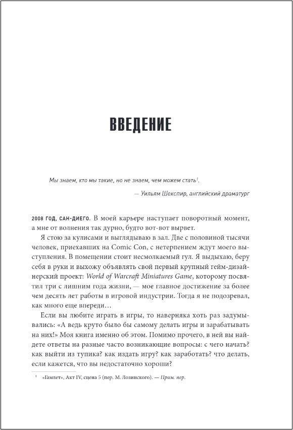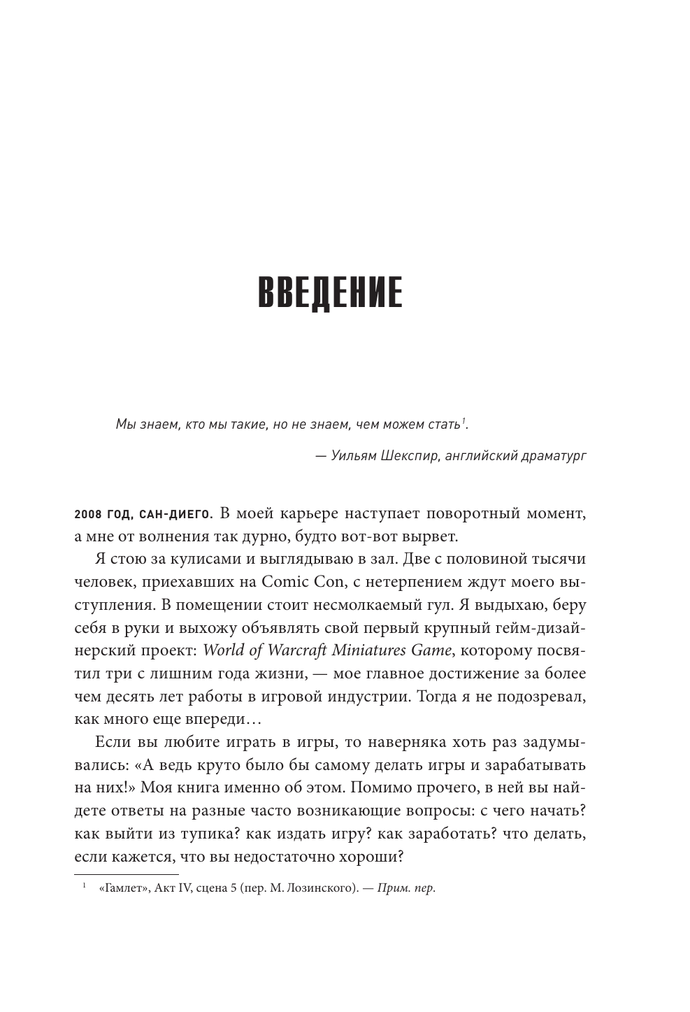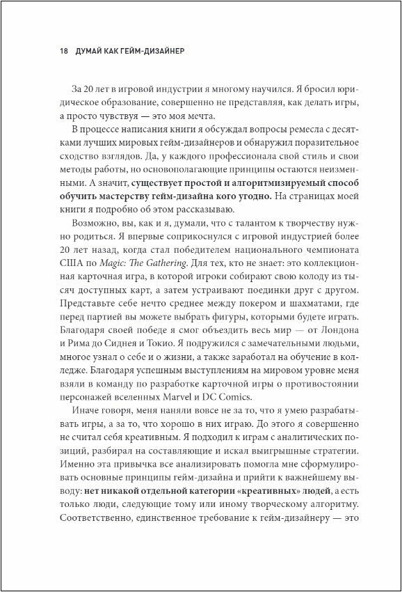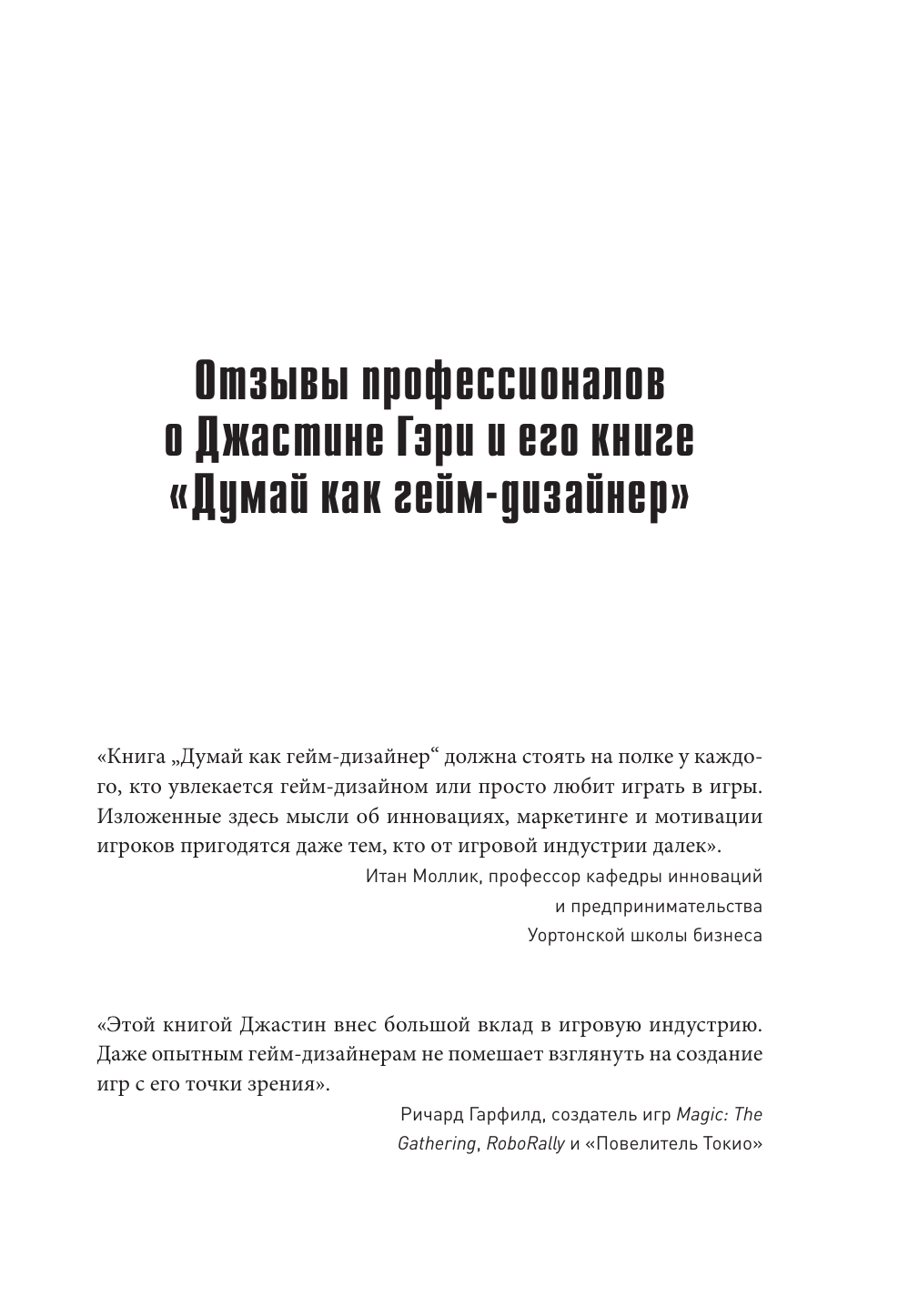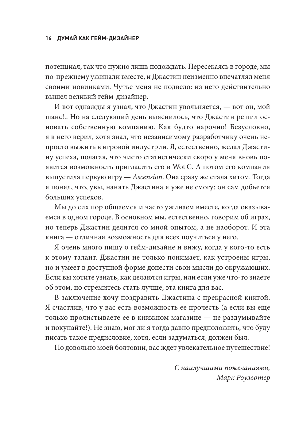 Вы любите игры и хотите научиться профессионально их создавать? Тогда эта книга идеально вам подойдет! Джастин Гэри двадцать лет проработал в игровой индустрии и теперь готов поделиться своими секретами - простыми, практичными и эффективными. Джастин проведет вас через каждый этап создания игры, даст советы и научит упражнениям, которые помогут вам сформулировать свои идеи и воплотить их в жизнь. Вы научитесь: - преодолевать ментальные блоки и творчески мыслить; - вызывать у игроков правильные эмоциональные реакции; - проводить мозговой штурм идей и находить пригодные для использования; - проходить шести этапов основного цикла проектирования для создания игры; - интегрировать в свои проекты монетизацию; - избегать рутины и выгорания или использовать их в своих интересах; - искать работу в игровой индустрии и добиваться публикации своих игр; - проводить грамотный и эффективный маркетинг; - создавать проекты, которые выдержат испытание временем. Сделайте первый шаг к своей мечте стать успешным гейм-дизайнером! Джастин Гэри - отмеченный наградами гейм-дизайнер и предприниматель. Он начал карьеру геймера в семнадцать лет, когда выиграл национальный чемпионат США по Magic: The Gathering. Он работал над Solforge и World of Warcraft Miniatures, а в 2010 году основал компанию Gary Games, которая выпустила популярную игру Ascension. «Джастин Гэри написал увлекательную книгу, в которой основы гейм-дизайна представлены в легком формате, понятном любому читателю. Если вы новичок в геймдеве, это отличный способ начать! » - Джесси Шелл, генеральный директор Schell Games и автор книги «Геймдизайн. Как создать игру, в которую будут играть все»