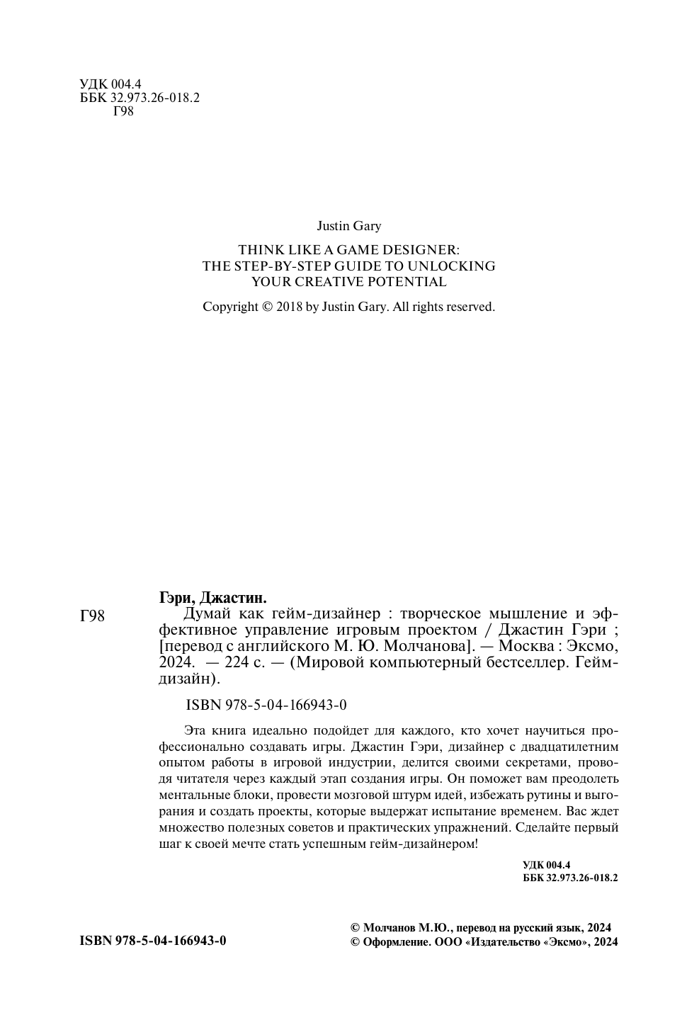 Думай как гейм-дизайнер. Творческое мышление и эффективное управление игровым проектом (Гэри Джастин); ООО "Издательство "Эксмо", 2024