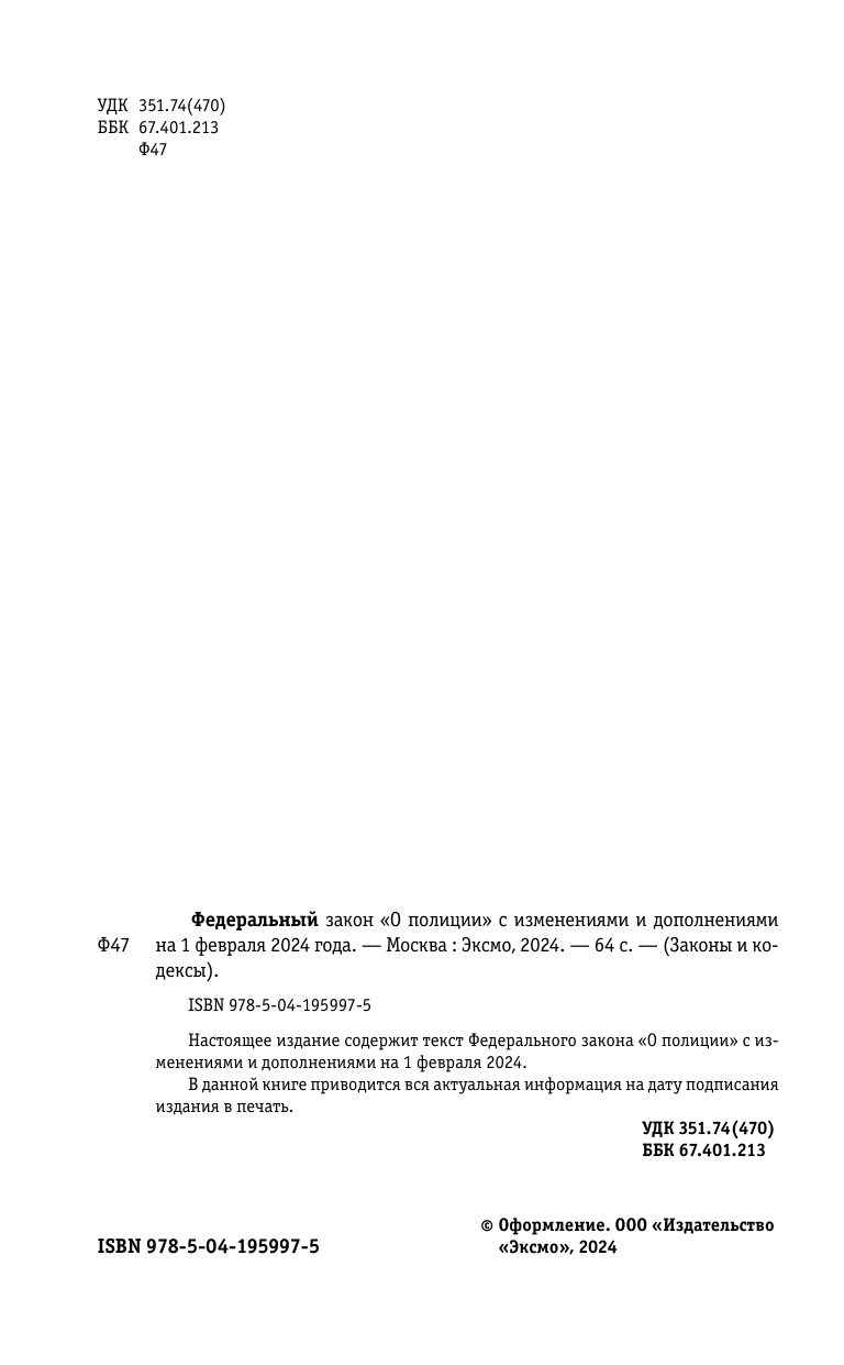 Федеральный закон "О полиции". Текст с изменениями и дополнениями на 1 февраля 2024 года (без автора); ООО "Издательство "Эксмо", 2024