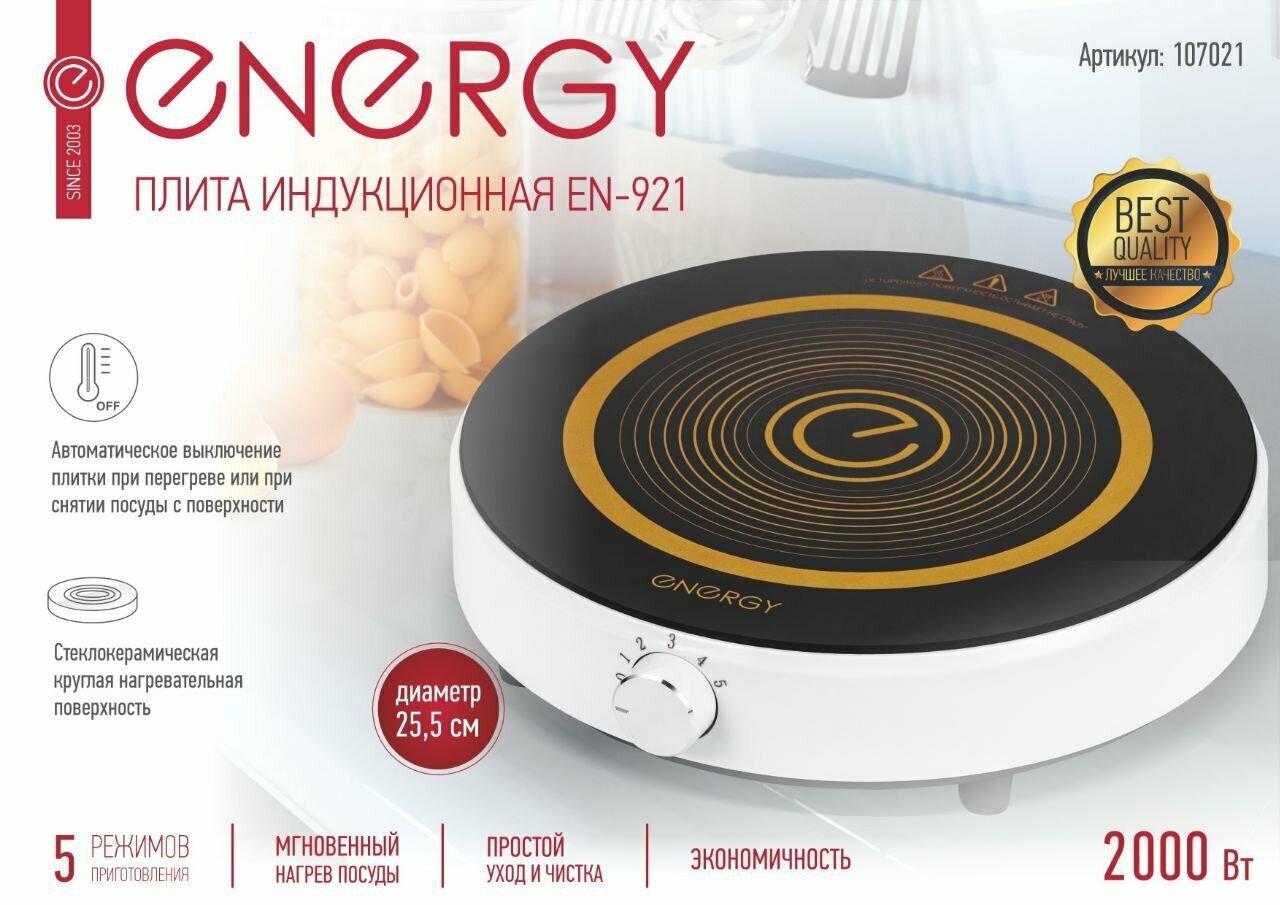 Индукционная плита ENERGY EN-921 - это современное и эффективное устройство для приготовления пищи, которое обеспечивает быстрый и безопасный нагрев. Благодаря использованию индукционного нагревательного элемента, плита мгновенно реагирует на изменение мощности и температуры, что позволяет быстро и точно контролировать процесс приготовления. Круглая стеклокерамическая нагревательная поверхность диаметром 25.5 мм обеспечивает равномерное распределение тепла, что гарантирует высокое качество приготовления блюд. Плита имеет 5 режимов приготовления, которые позволяют выбирать оптимальную мощность для различных типов продуктов и рецептов. Одним из преимуществ ENERGY EN-921 является режим автоматического выключения плиты при перегреве или при снятии посуды с нагревательной поверхности. Это обеспечивает безопасность использования устройства и предотвращает возможные повреждения. Плита обладает мощностью 2000 Вт, что позволяет ей быстро и эффективно нагревать посуду и продукты. ENERGY EN-921 станет отличным выбором для тех, кто ценит удобство, безопасность и эффективность в приготовлении пищи.