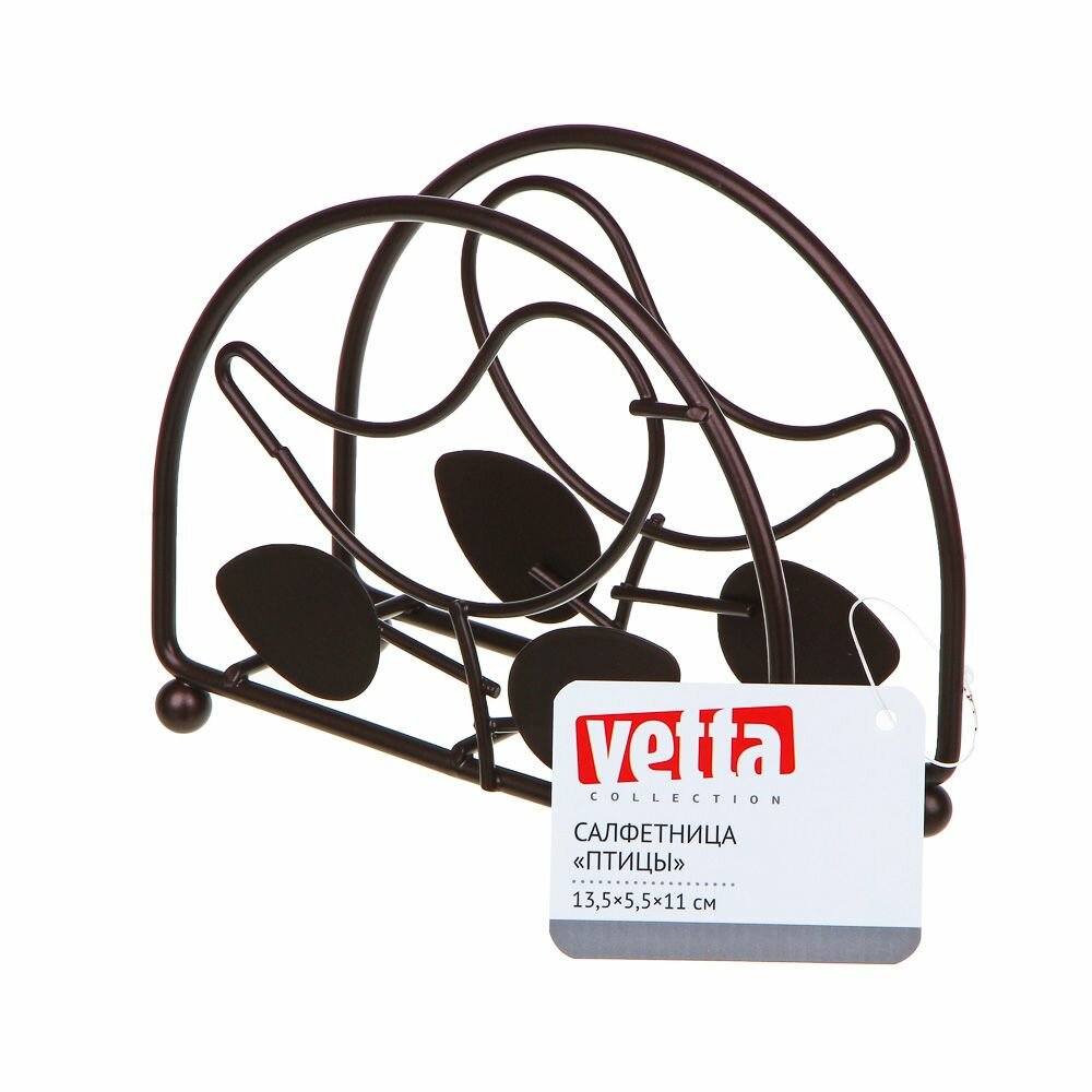 Салфетница VETTA Птицы из стали необходимый аксессуар для кухни, который украсит обеденный, праздничный стол или столешницу. Вмещает в себя большое количество бумажных салфеток, при этом не занимает много места. Имеет привлекательный дизайн и устойчивый прочный стальной каркас с гладкими металлическими ножками, которые не скользят по столу и не царапают его поверхность.