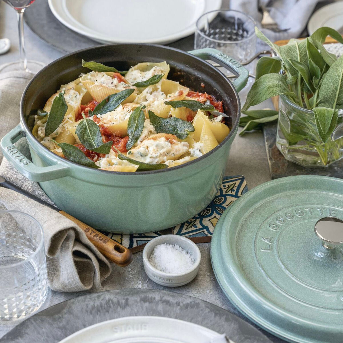 Пришло время новых цветов на вашей кухне! Пастельно-зелёный цвет серии Staub Sage свежий и необычный, но ненавязчивый и подходит ко многим стилям оформления. Этот круглый кокот объемом 3,8 литра и диаметром 24 см идеально подходит для семейного приготовления пищи или для основного блюда званого ужина. Он также отлично подходит для выпечки хлеба, в результате чего получается красивая круглая буханка.