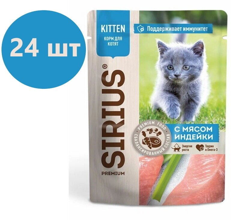 SIRIUS — влажный корм премиум-класса для полноценного ежедневного рациона котят с 1-2-х месяцев до 1 года. Высокое содержание мясных ингредиентов обеспечивает оптимальный уровень белка и укрепляет мышцы. Корм содержит натуральные ингредиенты, а также все необходимые микроэлементы и витамины для здорового роста и развития питомца. Состав: мясо, мясные и куриные субпродукты не менее 35% (в т. ч. индейка не менее 4%), рыба, злаки, клюква, загуститель, витамины, минеральные вещества, льняное масло, таурин, глюкозамин, хондроитин, экстракт юкки. Пищевая ценность (100 г): сырой белок 9%, сырой жир - 5%, сырая зола - 2,5%, сырая клетчатка - 0,5%, кальций - 0,3%, фосфор - 0,3%, влажность - 82%. Витамины и минеральные вещества (100 г) не менее: витамин А - 180 МЕ, витамин D - 18 МЕ, витамин E - 1,4 МЕ , цинк - 3 мг, железо - 1,8 мг, медь - 0,09 мг, марганец - 0,18 мг, таурин - 60 мг. Энергетическая ценность (на 100 г) не менее: 80 ккал /335 кДж. витамин А - 180 МЕ, витамин D - 18 МЕ, витамин E - 1,4 МЕ , цинк - 3 мг, железо - 1,8 мг, медь - 0,09 мг, марганец - 0,18 мг, таурин - 60 мг.