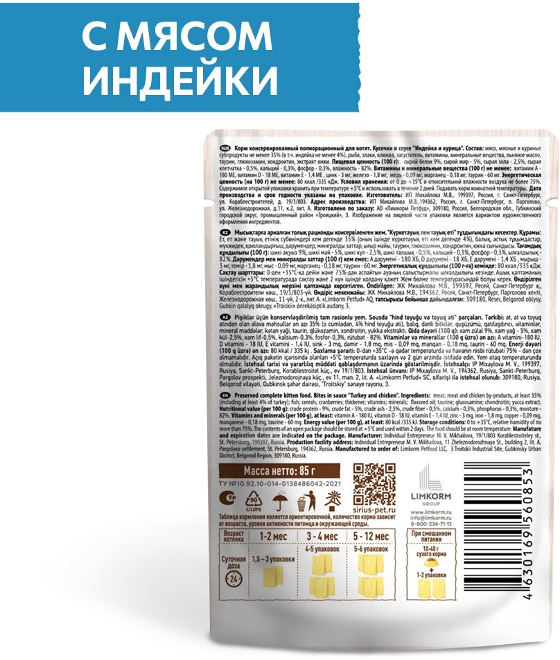 Sirius Влажный корм (пауч) для котят с индейкой и курицей 85 гр.