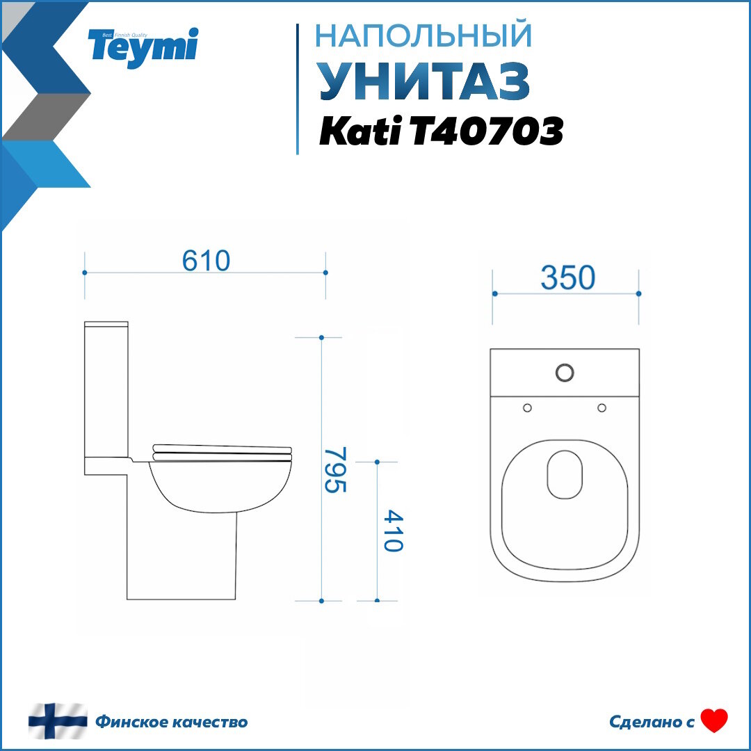 Напольный унитаз от известного финского бренда Teymi – это классический унитаз, состоящий из привычных чаши и бачка с двойной кнопкой смыва (полный/эконом). Унитаз изготовлен из качественного санфарфора - прочного и долговечного материала, который устойчив к сколам и внешним повреждениям, а поверхность отличается особой гладкостью, что значительно облегчает смыв. Подвод воды находится снизу, а выпуск - универсальный. Сантехника Teymi давно зарекомендовала себя на международном и российском рынке. Все изделия, выпускаемые этой маркой, получают исключительно положительные отзывы от покупателей. Широкий ассортимент продукции, многообразие форм и размеров и неизменное качество продукции — вот главные преимущества компании.