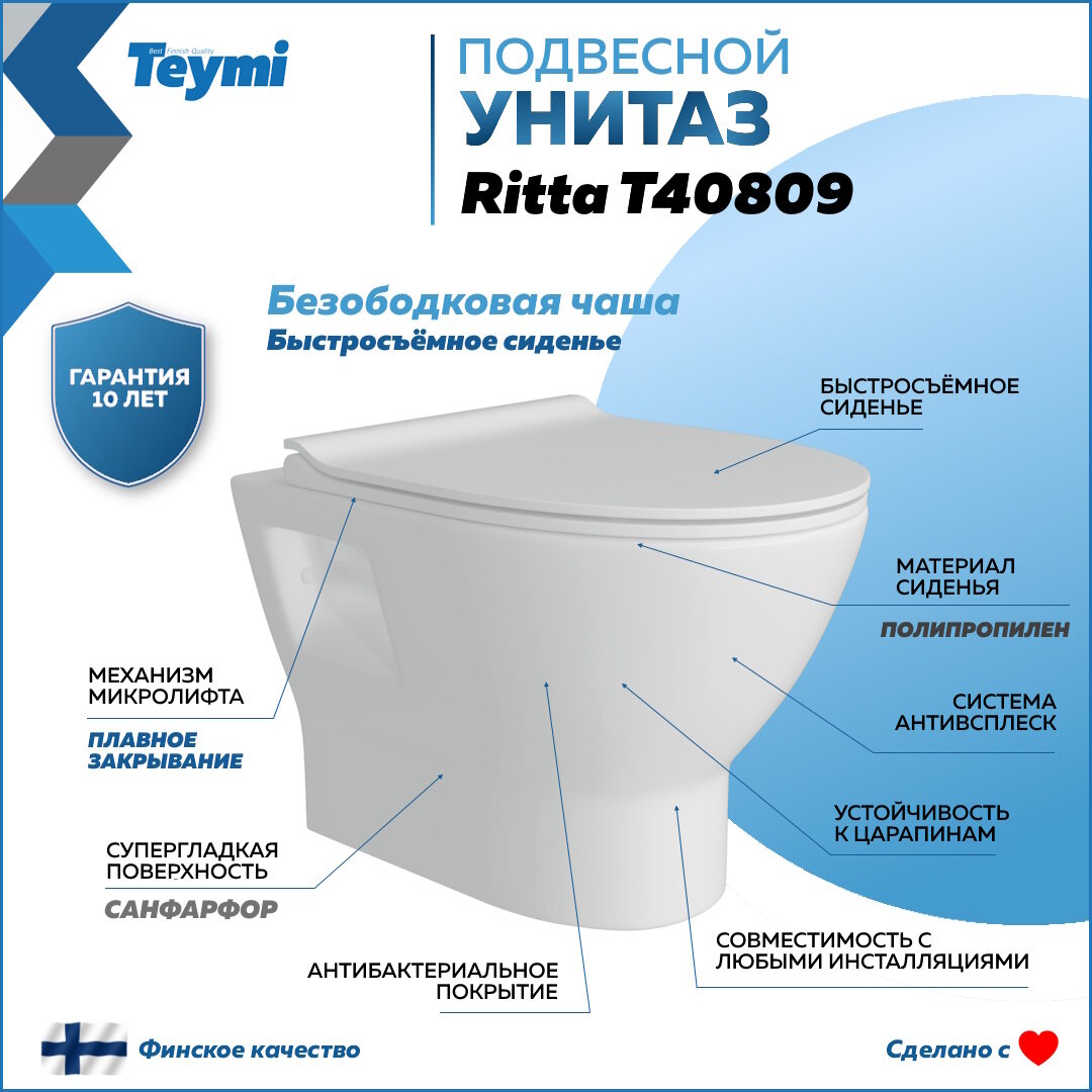Подвесной унитаз от известного финского бренда Teymi изготовлен из качественного санфарфора - прочного и долговечного материала, который устойчив к сколам и внешним повреждениям, а поверхность отличается особой гладкостью, что значительно облегчает смыв.. Сантехника Teymi давно зарекомендовала себя на международном и российском рынке. Все изделия, выпускаемые этой маркой, получают исключительно положительные отзывы от покупателей. Широкий ассортимент продукции, многообразие форм и размеров и неизменное качество продукции — вот главные преимущества компании.