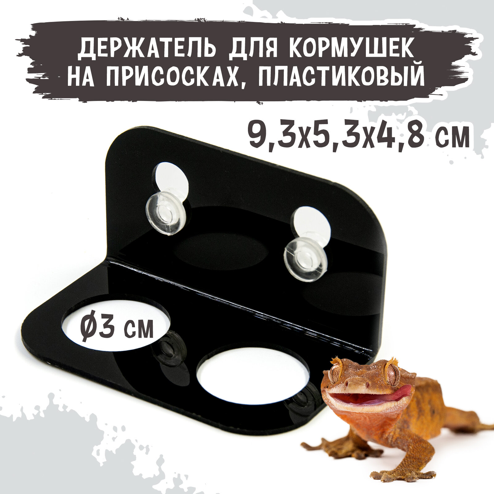 Держатель для кормушек крепится на стенку террариума с помощью присосок и используется для установки небольших кормушек (НЕ идут в комплекте!). На держателе имеется два отверстия под кормушки диаметром 3 см. Держатель отлично подойдет для кормления небольших рептилий и амфибий, таких как: лягушки, лазающие по стеклу гекконы. В кормушку, закрепленную с помощью присосок на стенку террариума, можно положить небольших кормовых насекомых, а так же специальные фруктовые пюре для гекконов.