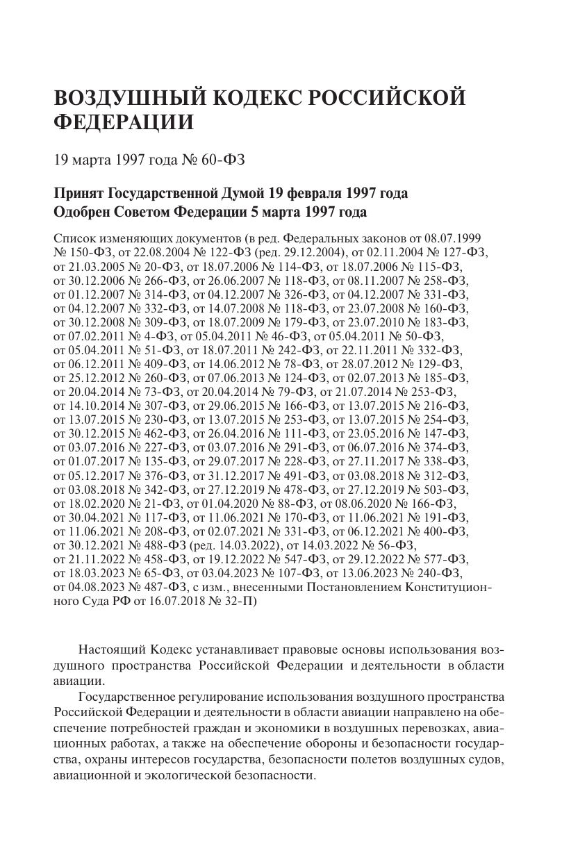 Настоящее издание содержит текст Воздушного кодекса Российской Федерации с изменениями и дополнениями на 2024 год. Если есть изменения, вступающие в силу позднее, то вместе с редакцией нормы, действующей на эту дату, приводится норма в новой редакции и указывается дата, с которой она вступает в силу.