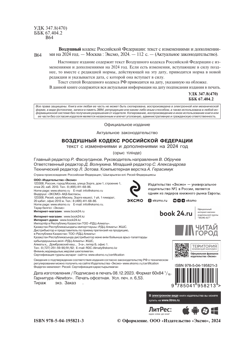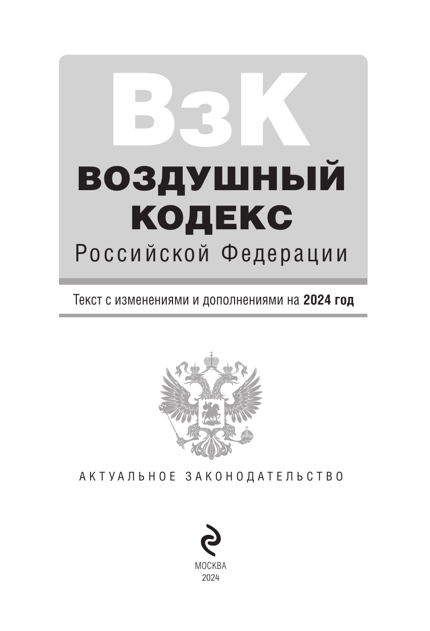 Воздушный кодекс РФ. В ред. на 2024 год / ВК РФ (без автора); ООО "Издательство "Эксмо", 2024