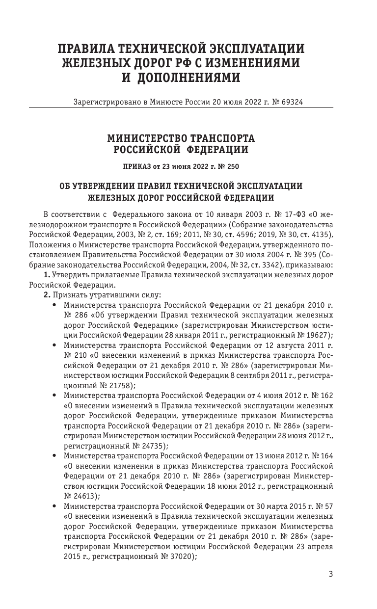 Правила технической эксплуатации железных дорог РФ приведен по Приказу Минтранса России от 23.06.2022 № 250 "Об утверждении Правил технической эксплуатации железных дорог Российской Федерации" с актуальной информацикй на дату продажи!