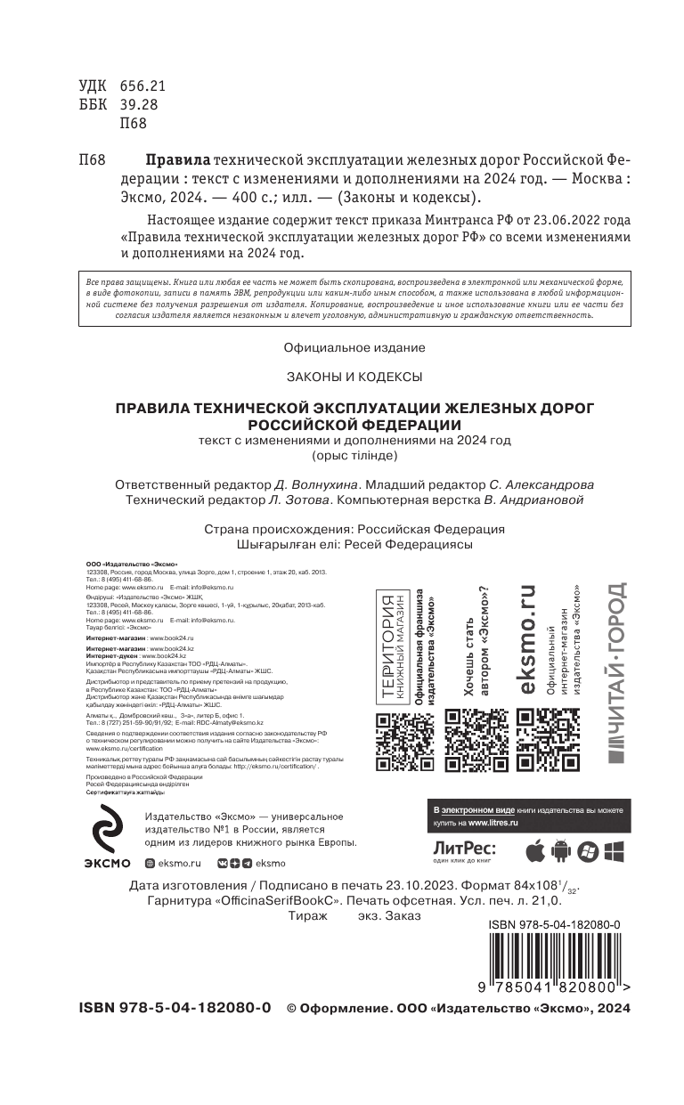На сегодняшний день товар «Книга: Правила технической эксплуатации железных дорог РФ с изменениями и дополнениями на 2024 год (без автора); ООО "Издательство "Эксмо", 2024» можно купить с кешбеком в 3 магазинах: Читай-город, book24, Буквоед