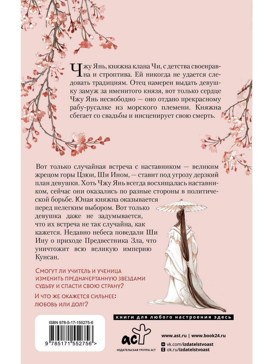 Чжу Янь, княжна клана Чи, с детства своенравна и строптива. Ей никогда не удается следовать традициям. Отец намерен выдать девушку замуж за именитого князя, вот только сердце Чжу Янь несвободно — оно отдано прекрасному рабу-русалке из морского племени. Княжна сбегает со свадьбы и инсценирует смерть. Вот только случайная встреча с наставником — великим жрецом горы Цзюи, Ши Ином, ставит под угрозу дерзкий план девушки. Хоть Чжу Янь всегда восхищалась наставником, сейчас они оказались по разные стороны в политической борьбе. Юная княжна оказывается перед нелегким выбором. Вот только девушка даже не задумывается, что их встреча не так случайна, как кажется. Недавно небеса поведали Ши Ину о приходе Предвестника Зла, что уничтожит всю великую империю Кунсан.