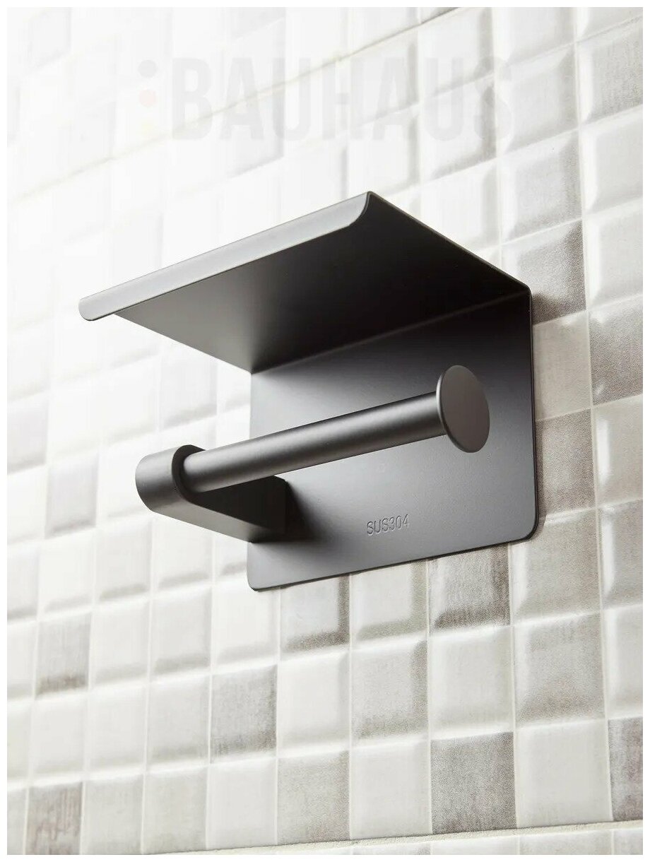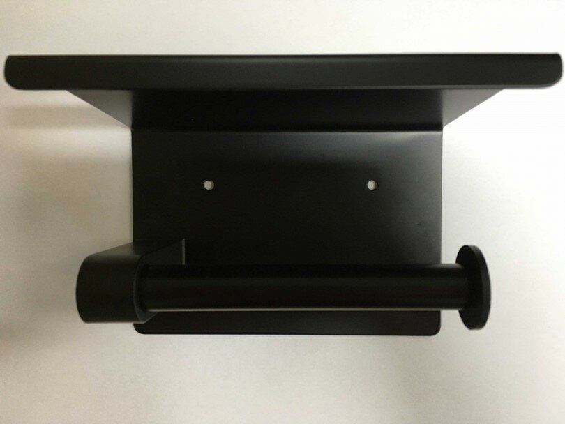 Металлический держатель для стандартных рулонов туалетной бумаги с полочкой для смартфона. Крепится к стене саморезами. Удобен в использовании дома и в общественных местах. Его отличие от остальных держателей в том, что у него есть полочка, на которой можно разместить телефон, поставить диффузор или освежитель воздуха.