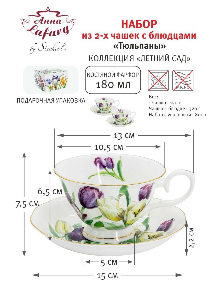 | Комплектация | Чашка 180 мл - 2 шт., блюдце 15 см - 2 шт. |