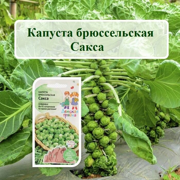 **Семена овощей Детская грядка капуста брюссельская Сакса** — позднеспелый сорт. Урожай начинают собирать через 150-165 суток после появления первых всходов. Растение достигает 0,7 м в высоту. Кочаны обладают яйцевидной формой, диаметром до 5 см. Цвет — серо-зеленый. Масса составляет по 15-20 г. Характеризуются плотностью, легкой горчинкой во вкусе. Один куст способен давать до 85 кочанов. Предназначены для употребления в пищу в свежем или отварном виде, для консервации. Хорошо держат форму при заморозке.