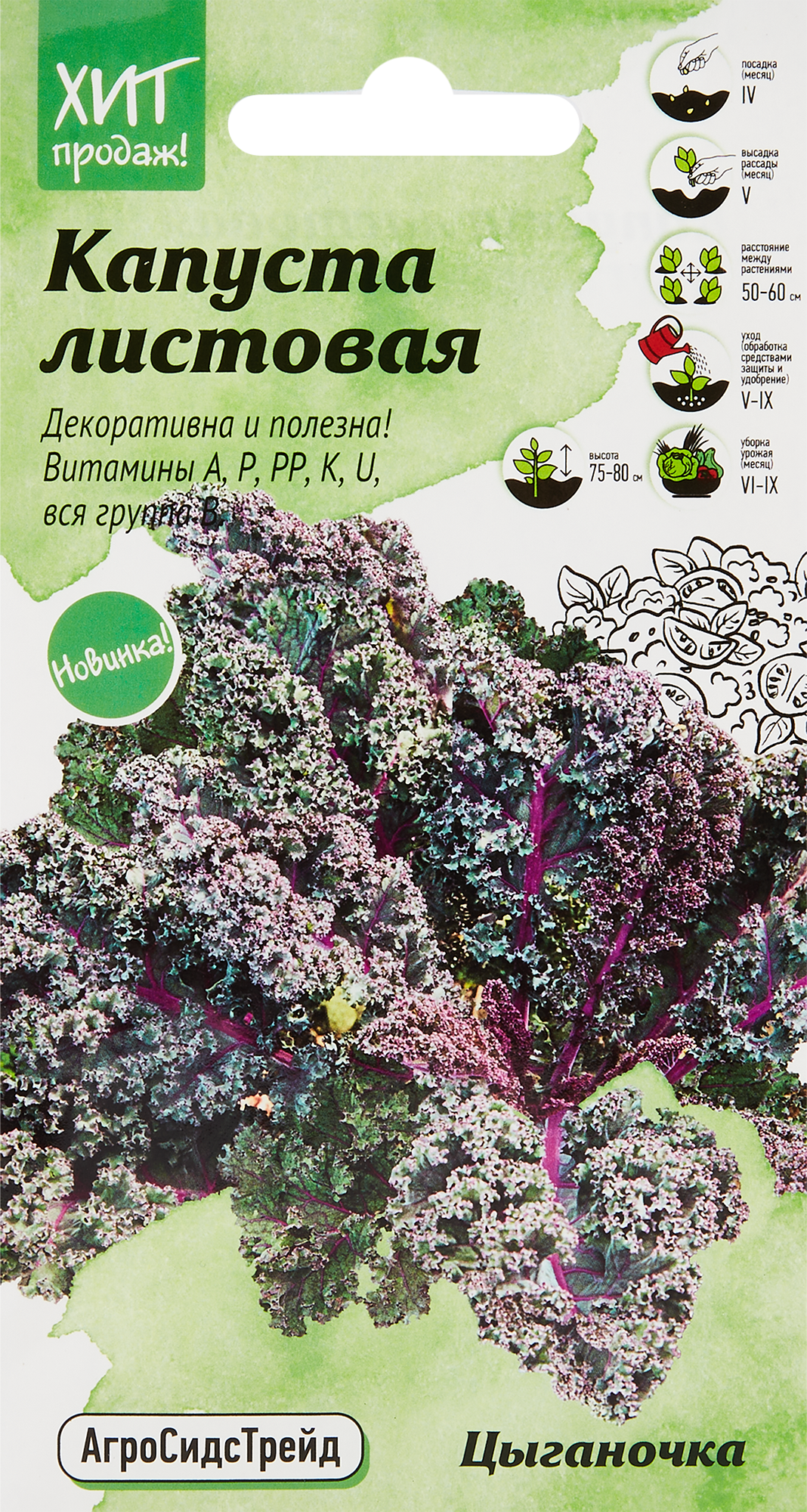 **Семена овощей Агросидстрейд капуста листовая Цыганочка** подходят для посева на рассаду в апреле. Пересадку в открытый грунт проводят в мае. Урожая собирают с июня по сентябрь. Обладает крупными сине-зелеными листьями.