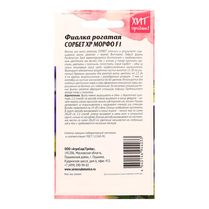 На сегодняшний день товар «Семена цветов Агросидстрейд фиалка рогатая Сорбет Xp Морфо F1 5 шт.» можно купить с кешбеком в 1 магазине: Яндекс.Маркет