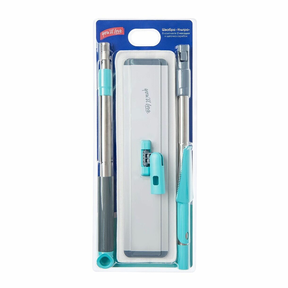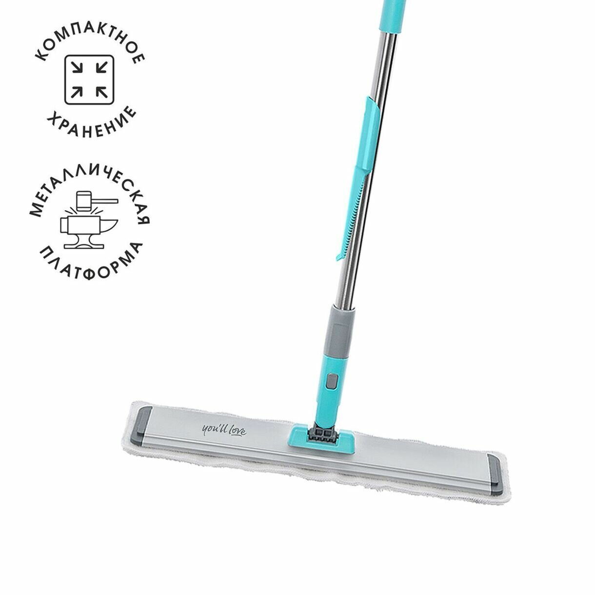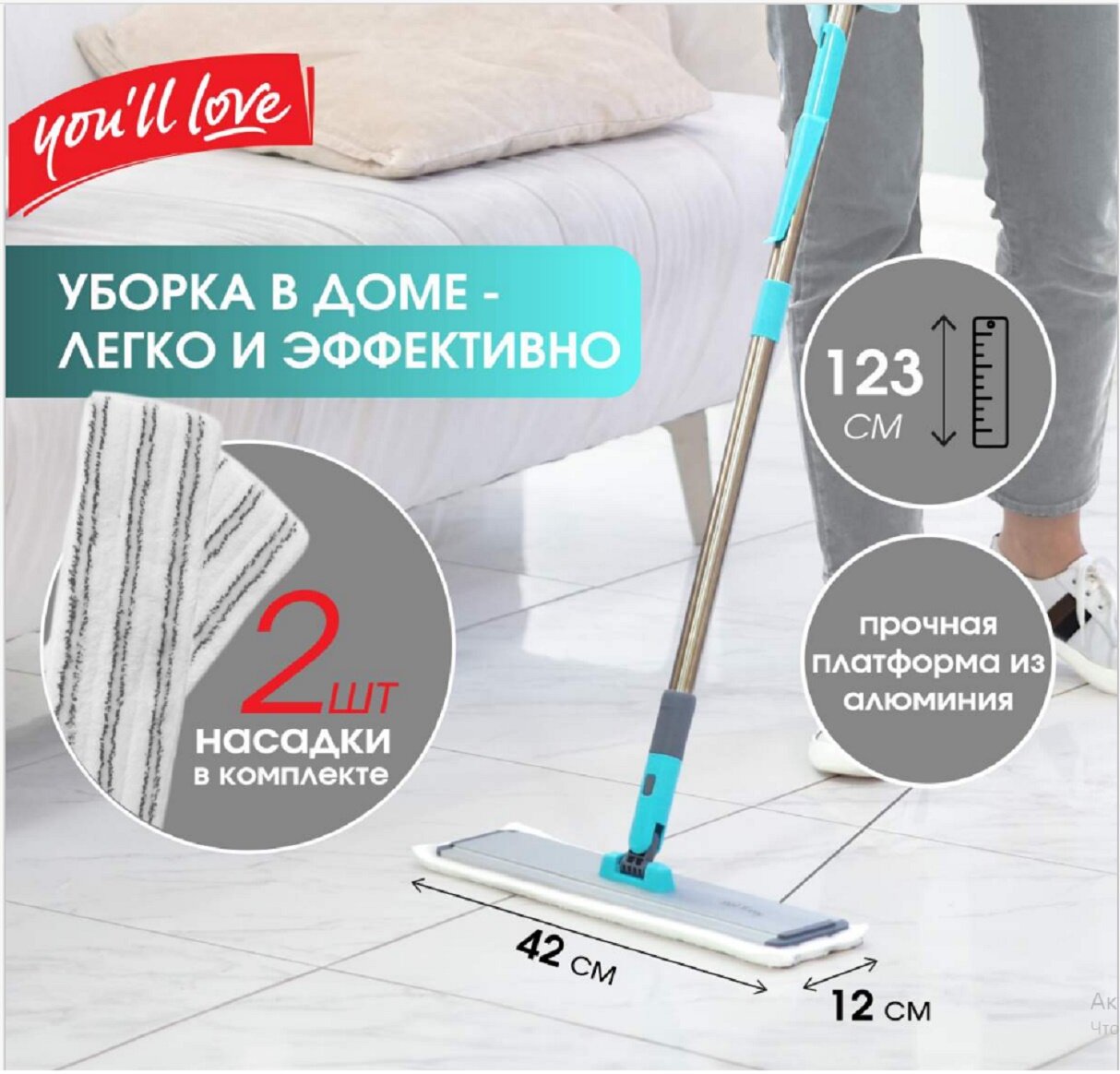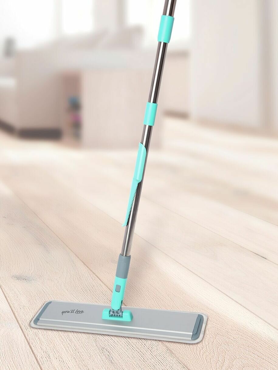 **Швабра для пола You ll Love** серии «Ультра» оснащена плоской металлической платформой и телескопической рукояткой, которую легко адаптировать под любой рост. Шарнирный механизм в основании конструкции поворачивается на 360°, что позволяет маневрировать вокруг мебели и в углах для тщательной обработки труднодоступных мест. Швабра комплектуется двумя съемными насадками (моп) из микрофибры, которые плотно прилегают к поверхностям, обеспечивая мягкое скольжение. Абразивные полосы на насадках способствуют устранению стойких загрязнений без повреждения покрытий. Подвес на черенке обеспечивает компактное хранение инструмента.