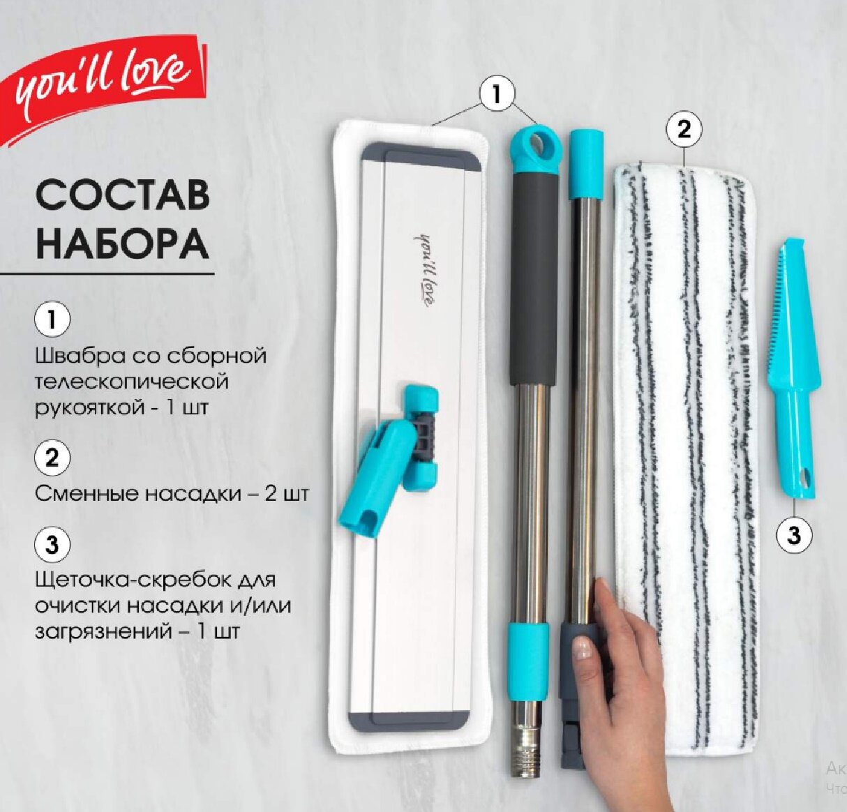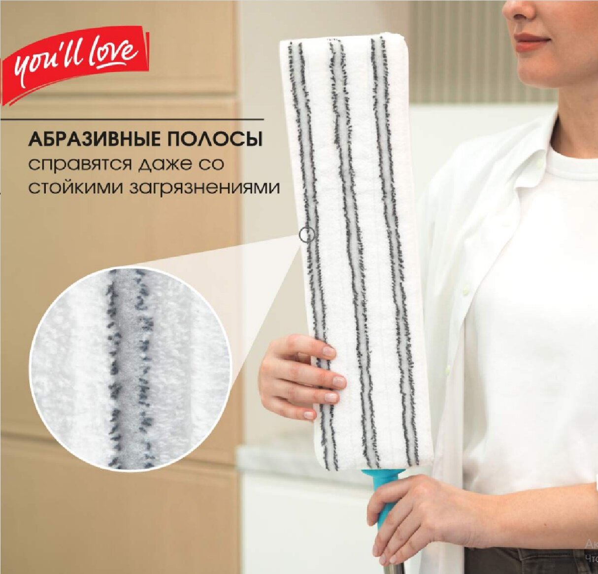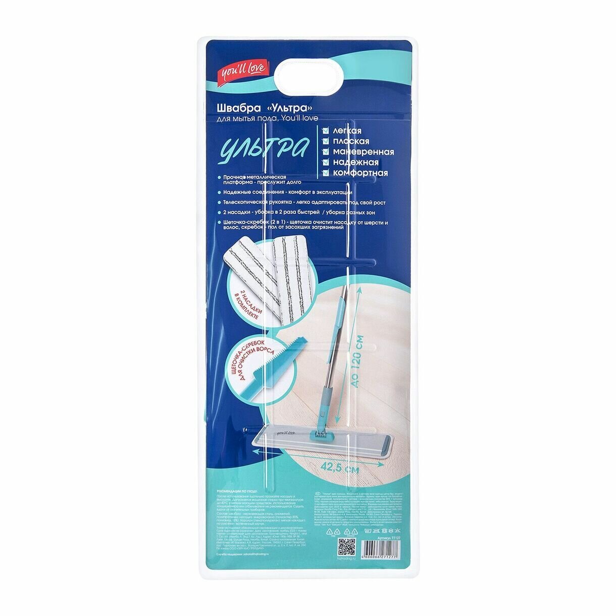 **Швабра для пола You ll Love** серии «Ультра» оснащена плоской металлической платформой и телескопической рукояткой, которую легко адаптировать под любой рост. Шарнирный механизм в основании конструкции поворачивается на 360°, что позволяет маневрировать вокруг мебели и в углах для тщательной обработки труднодоступных мест. Швабра комплектуется двумя съемными насадками (моп) из микрофибры, которые плотно прилегают к поверхностям, обеспечивая мягкое скольжение. Абразивные полосы на насадках способствуют устранению стойких загрязнений без повреждения покрытий. Подвес на черенке обеспечивает компактное хранение инструмента.