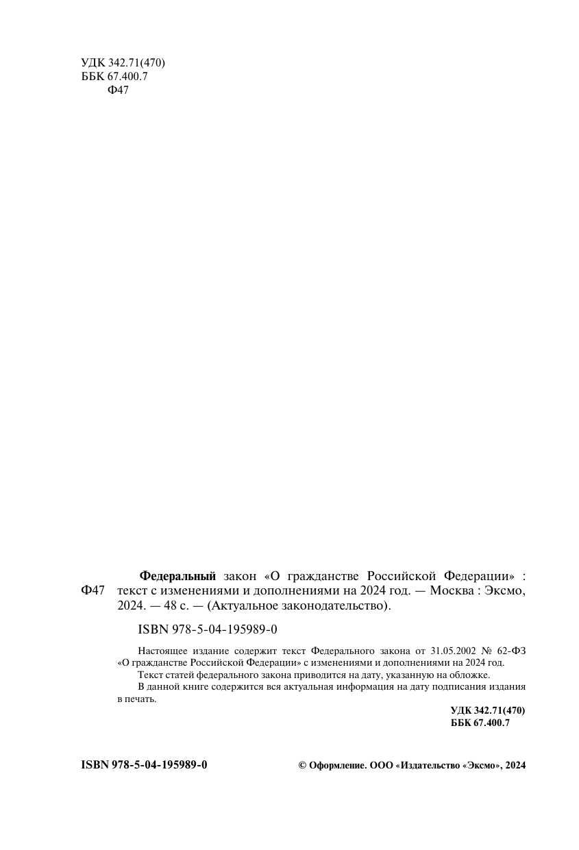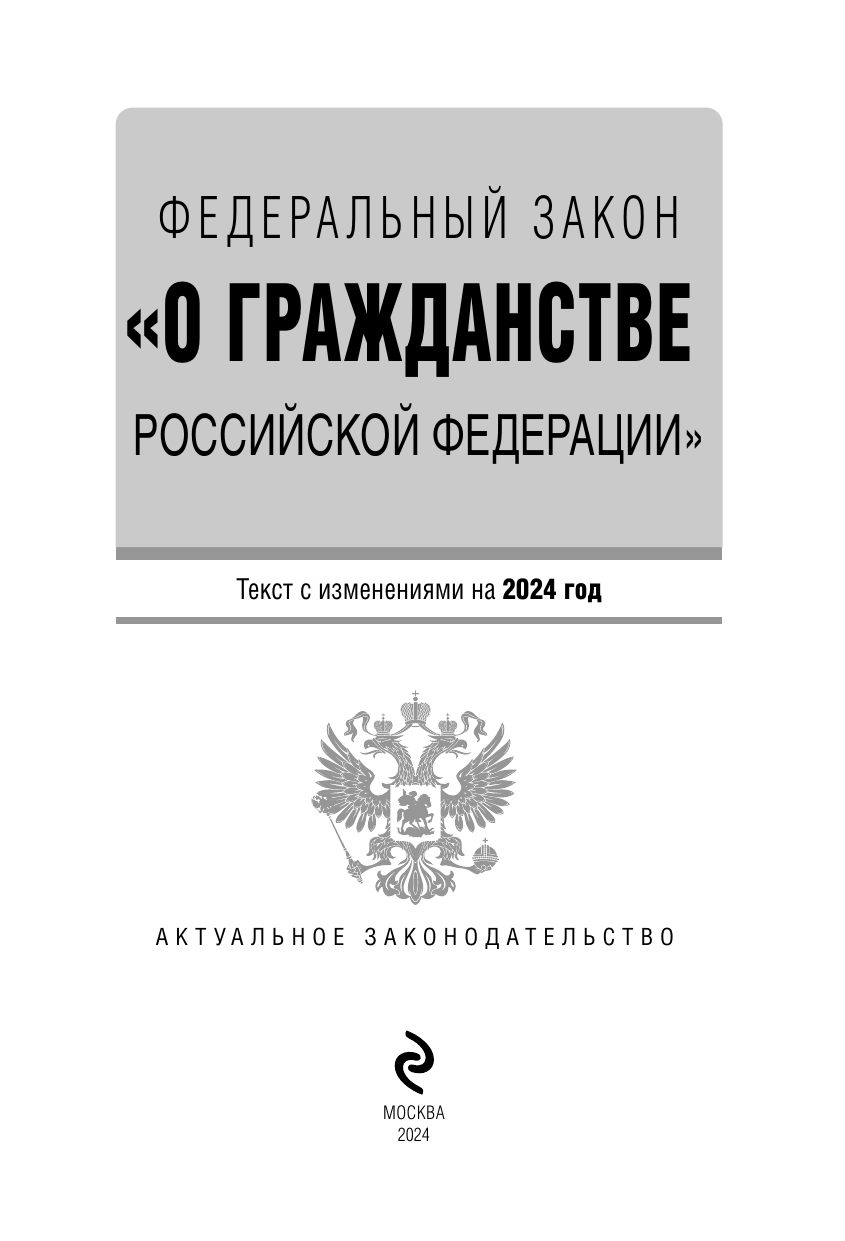 Федеральный закон "О гражданстве Российской Федерации": текст с изменениями и дополнениями на 2024 года (без автора); ООО "Издательство "Эксмо", 2024