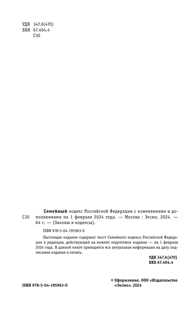 Семейный кодекс Российской Федерации с изменениями и дополнениями на 1 февраля 2024 года (без автора); ООО "Издательство "Эксмо", 2024