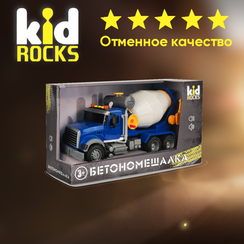 Бетономешалка KID ROCKS с прорезиненными колёсами, подвижными деталями, звуковыми и световыми эффектами - лучший для юного любителя городской спецтехники. Отличная детализация, реалистичный дизайн и большое количество подвижных элементов - обеспечат максимальное погружение в игру и помогут познакомить ребенка с видами городской спецтехники. Особенности игрушки: - Оснащена инерционным и звуковым механизмами. - Высокий уровень детализации. - Изготовлена из безопасной для детей пластмассы. Игрушка работает от 3 батареек AG 13, в комплекте демонстрационные.