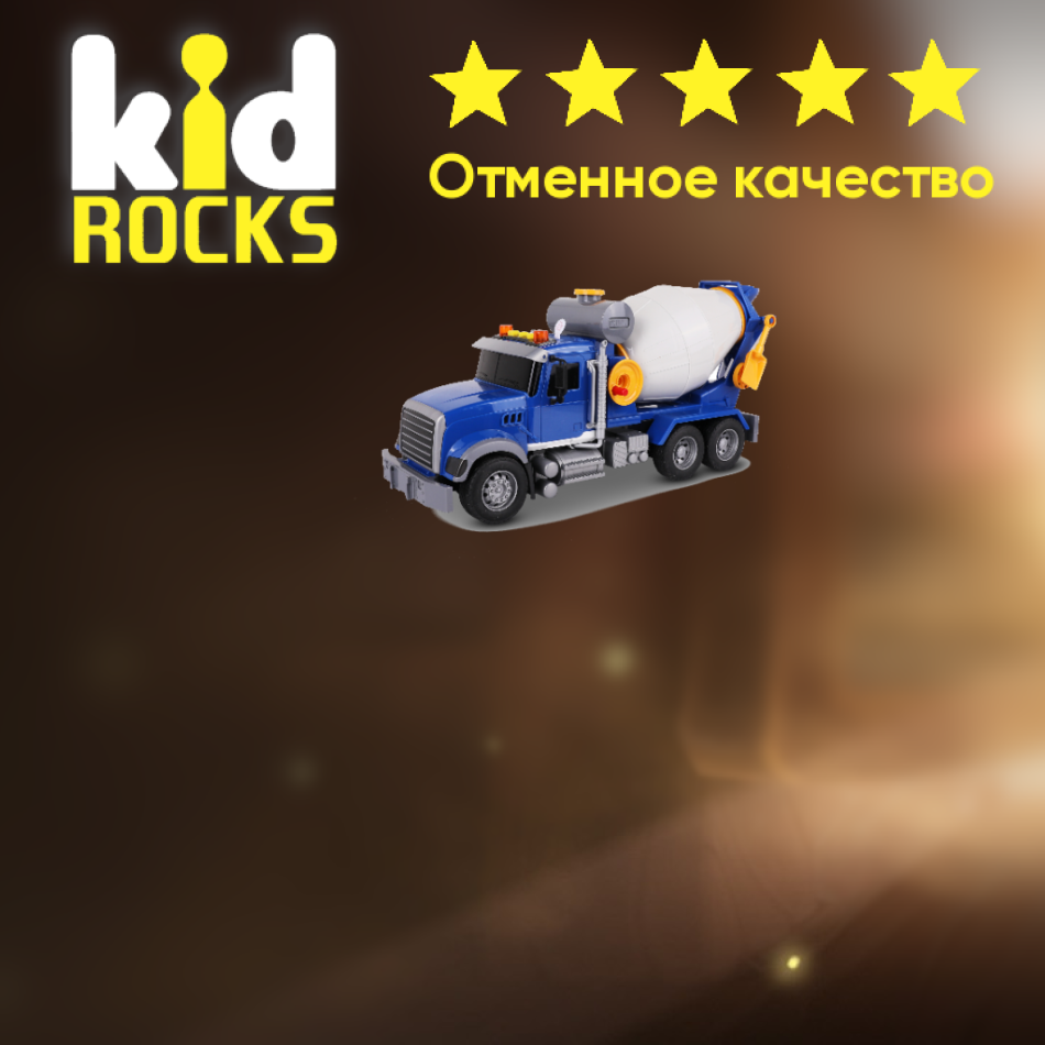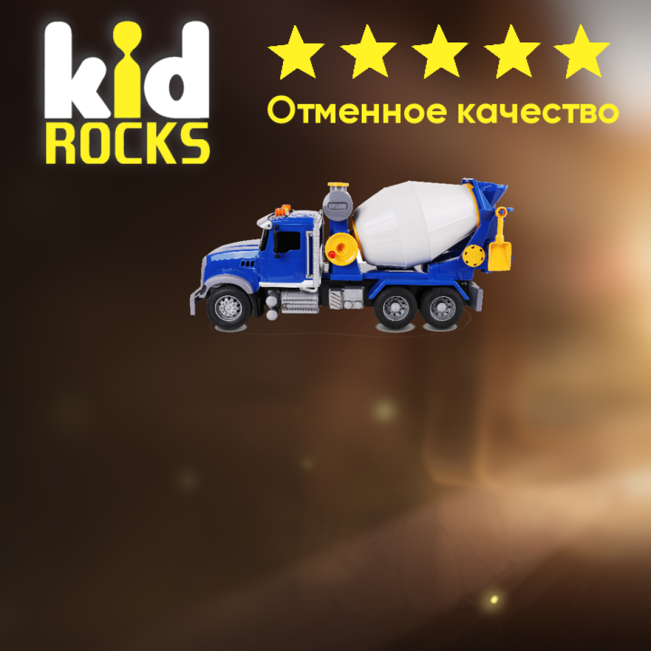 | Особенности | Машинка оснащена инерционным механизмом, при нажатии кнопок на крыше кабины машинка издаёт звуки запуска двигателя, клаксона, заднего хода, фары мигают, цементный бак вращается благодаря ручке, установленной на корпусе, бак за кабиной водителя можно наполнить песком/камушками, игрушка работает от 3 батареек AG13, входят в комплект. |