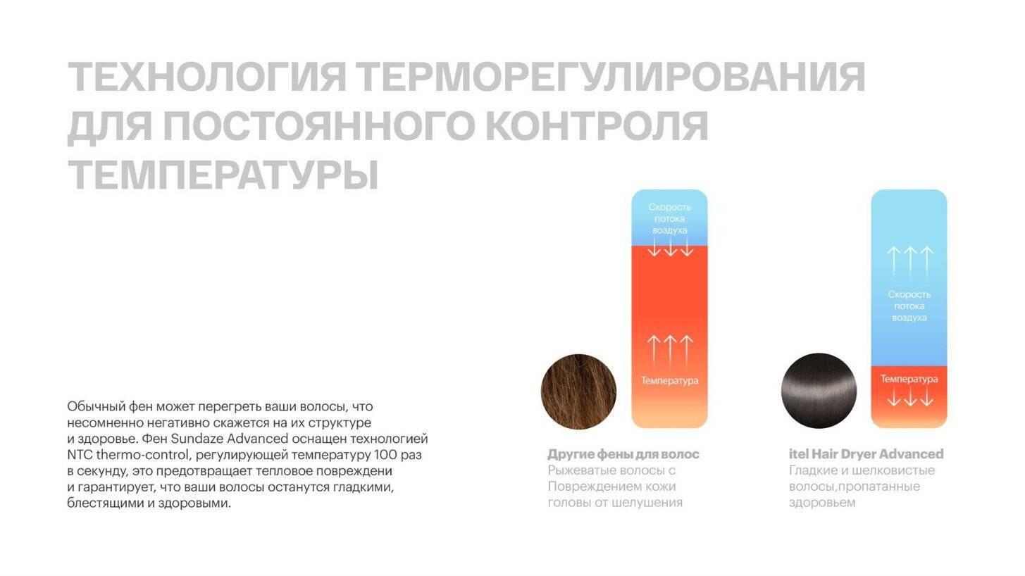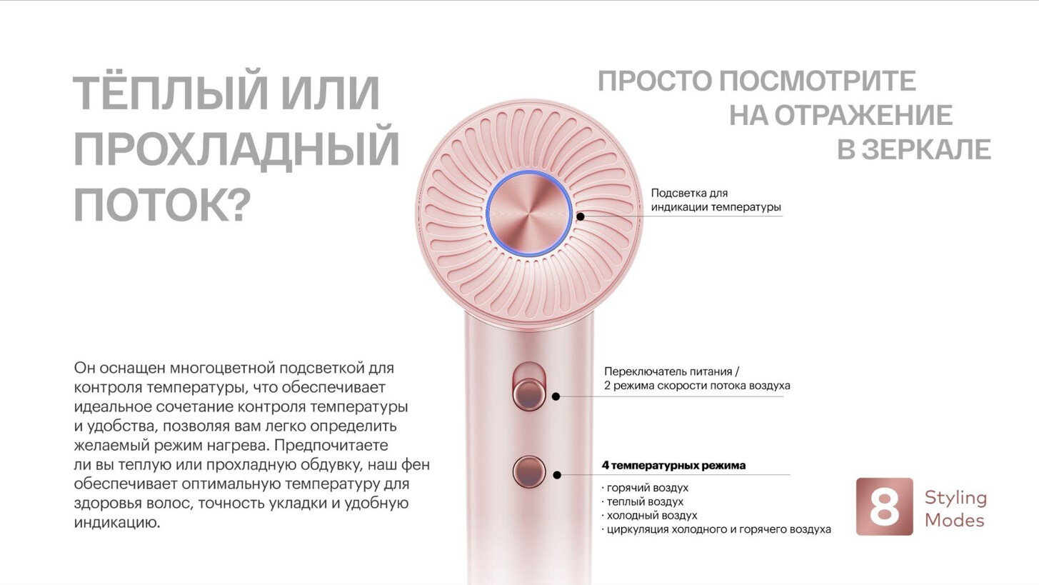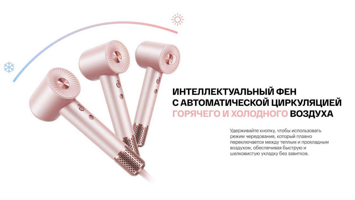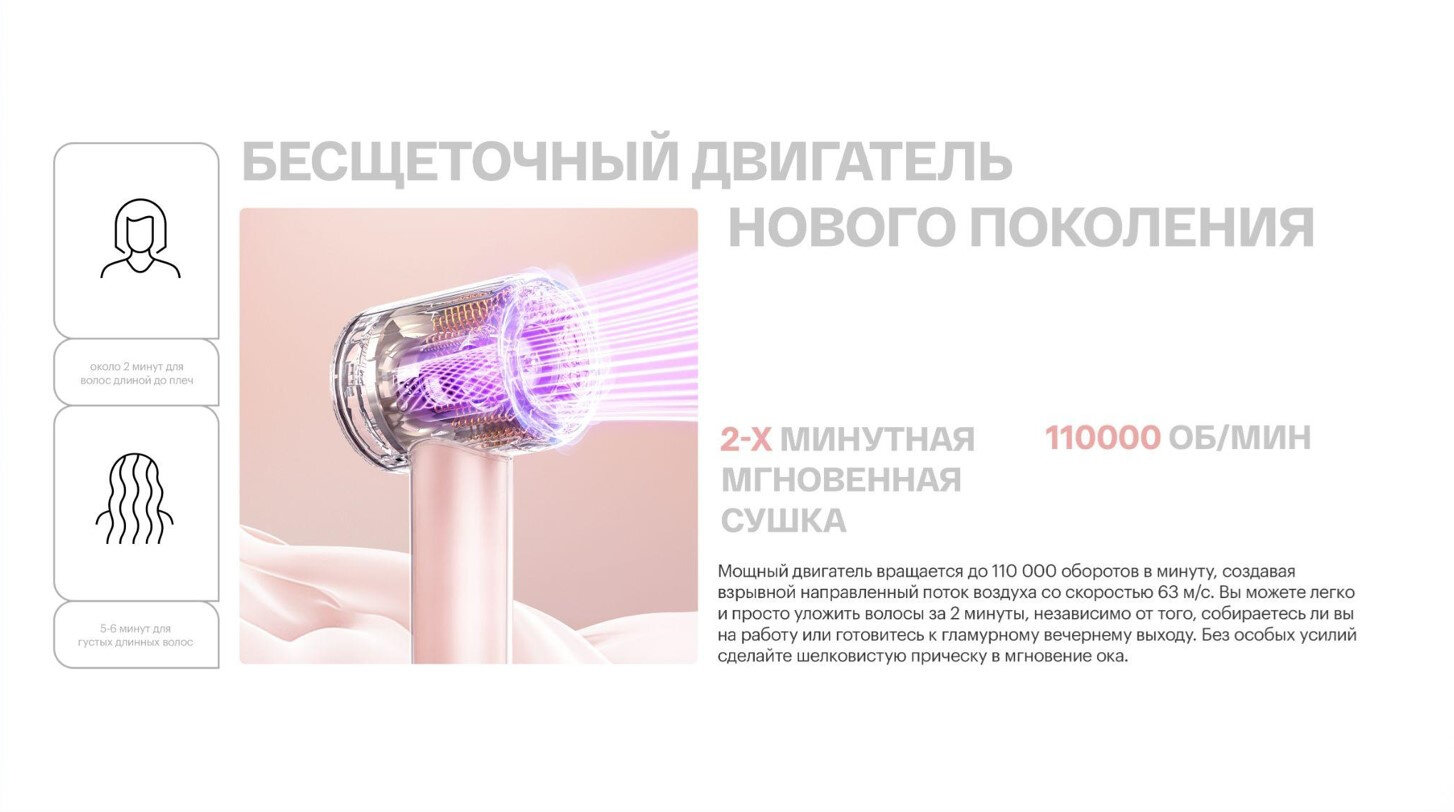Благодаря высокоскоростному бесщеточному двигателю с частотой вращения 110000 об/мин фен мгновенно генерирует мощный поток воздуха, который быстро сушит волосы, не повреждая их. Функция чередования подачи горячего и холодного воздуха.