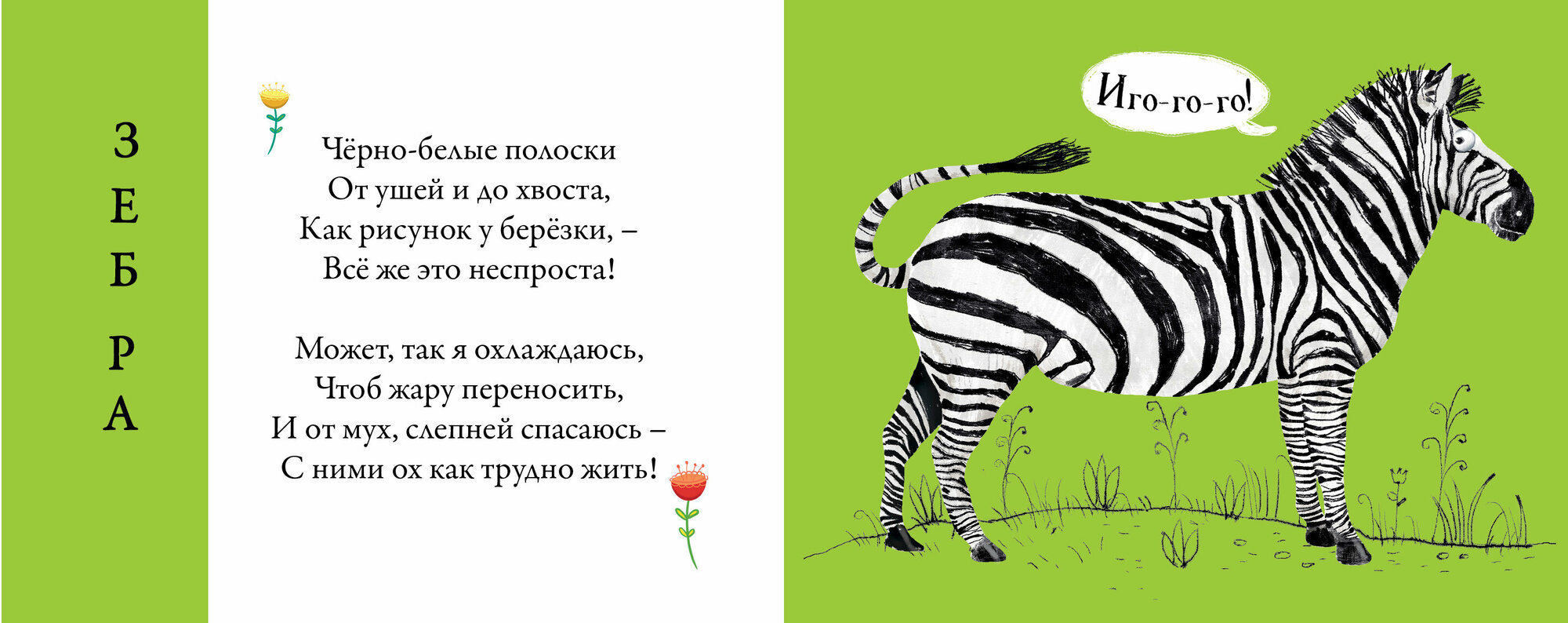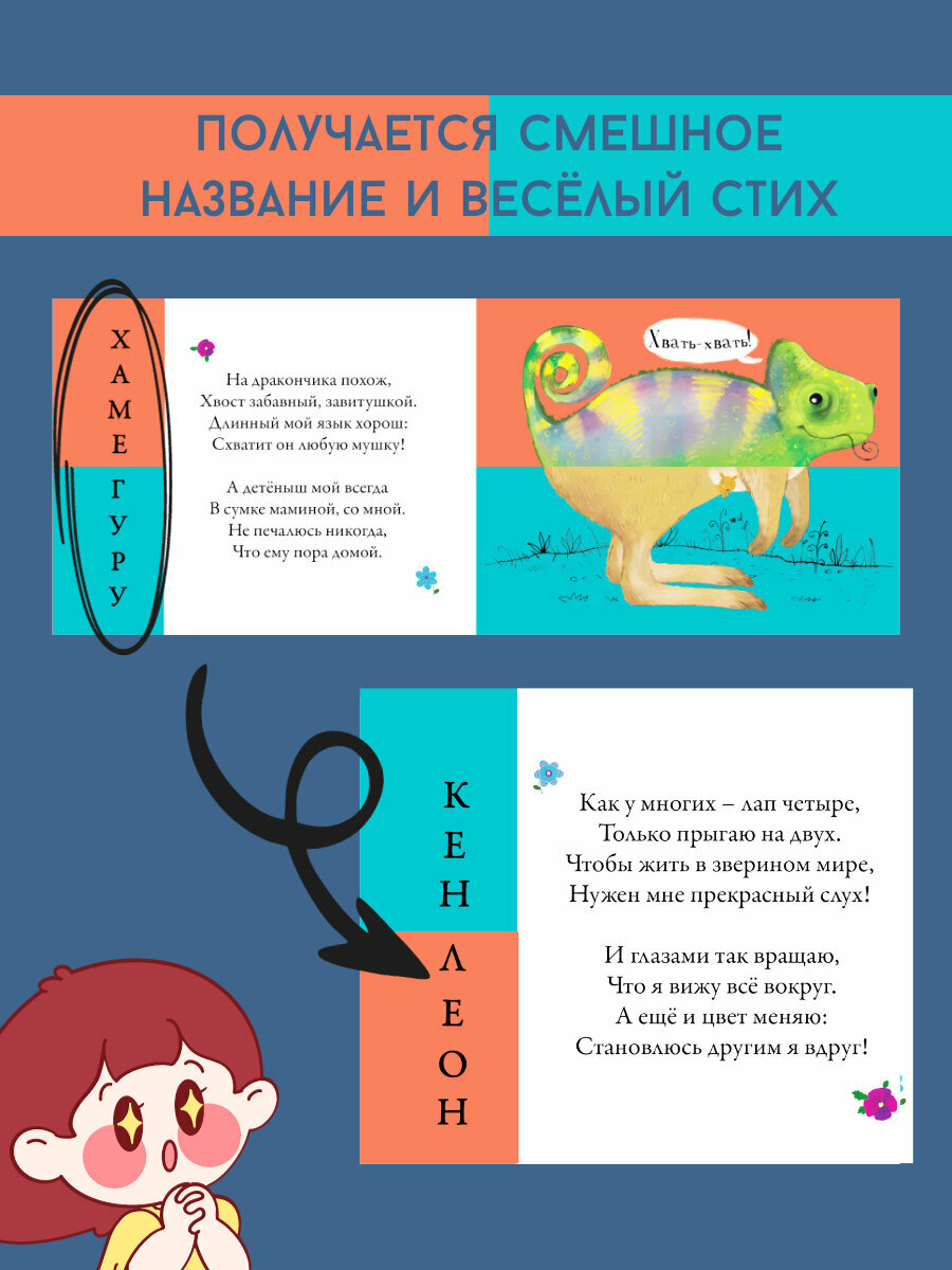 В книге вы найдете яркие и добрые изображения 12 животных на однотонном фоне, дополненные весёлыми стихотворениями Евгения Сосновского, которые описывают характерную внешность животного (рога, хвосты, уши и т.д.), особенности их поведения, а так же звуки, которые они издают. Благодаря конструкции книги, перелистывая страницы, каждая из которых разделена пополам, можно собрать 144 комбинации смешных несуществующих животных и не менее смешных их названий и описаний в стихах.
