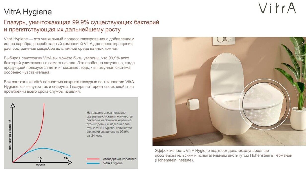 - Покрытие: антибактериальная глазурь VitrA Hygiene (уничтожающая 99,9% существующих бактерий и препятствующая их дальнейшему росту).