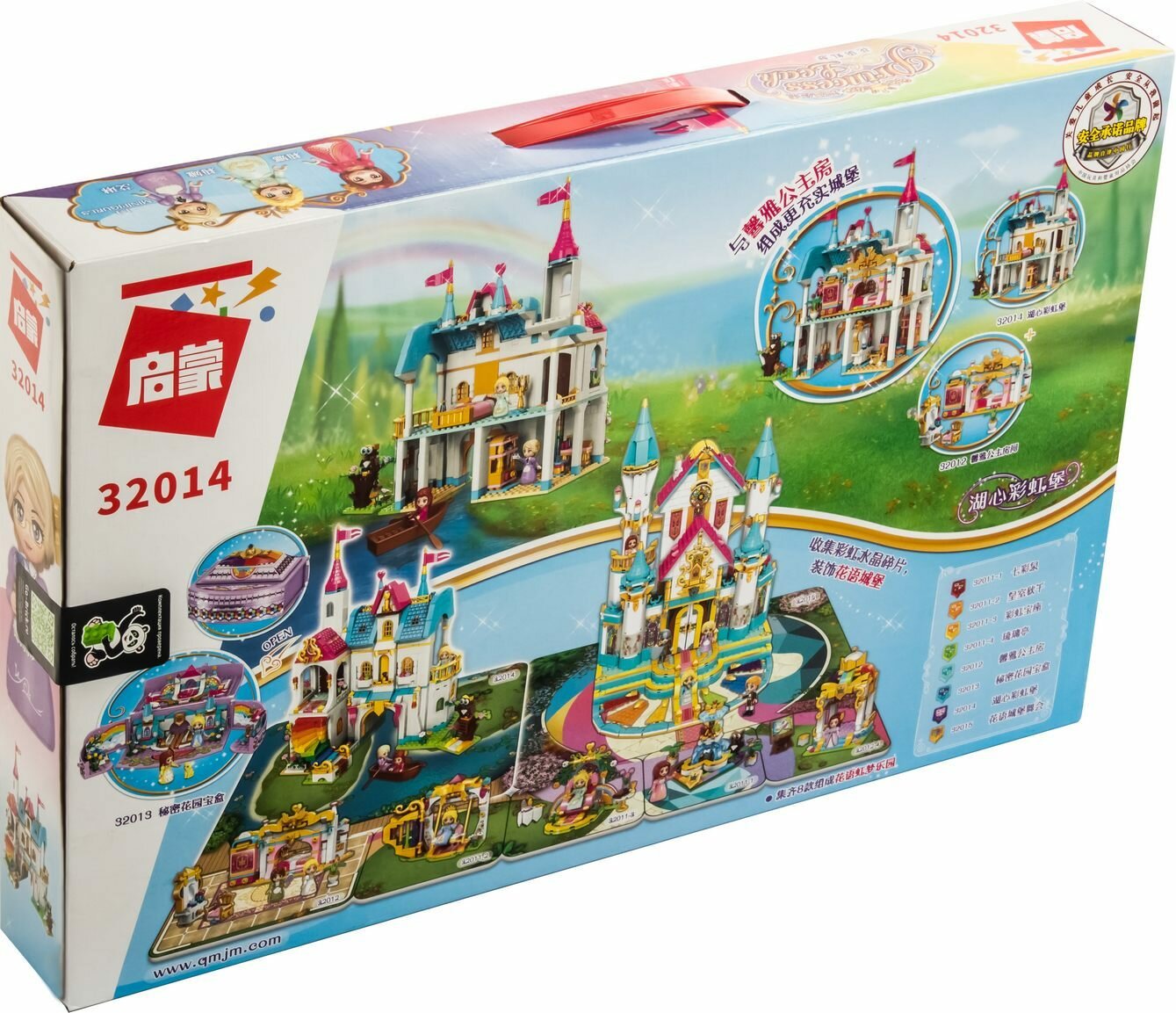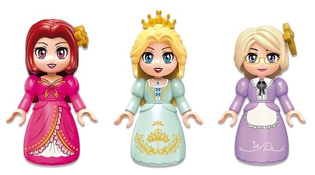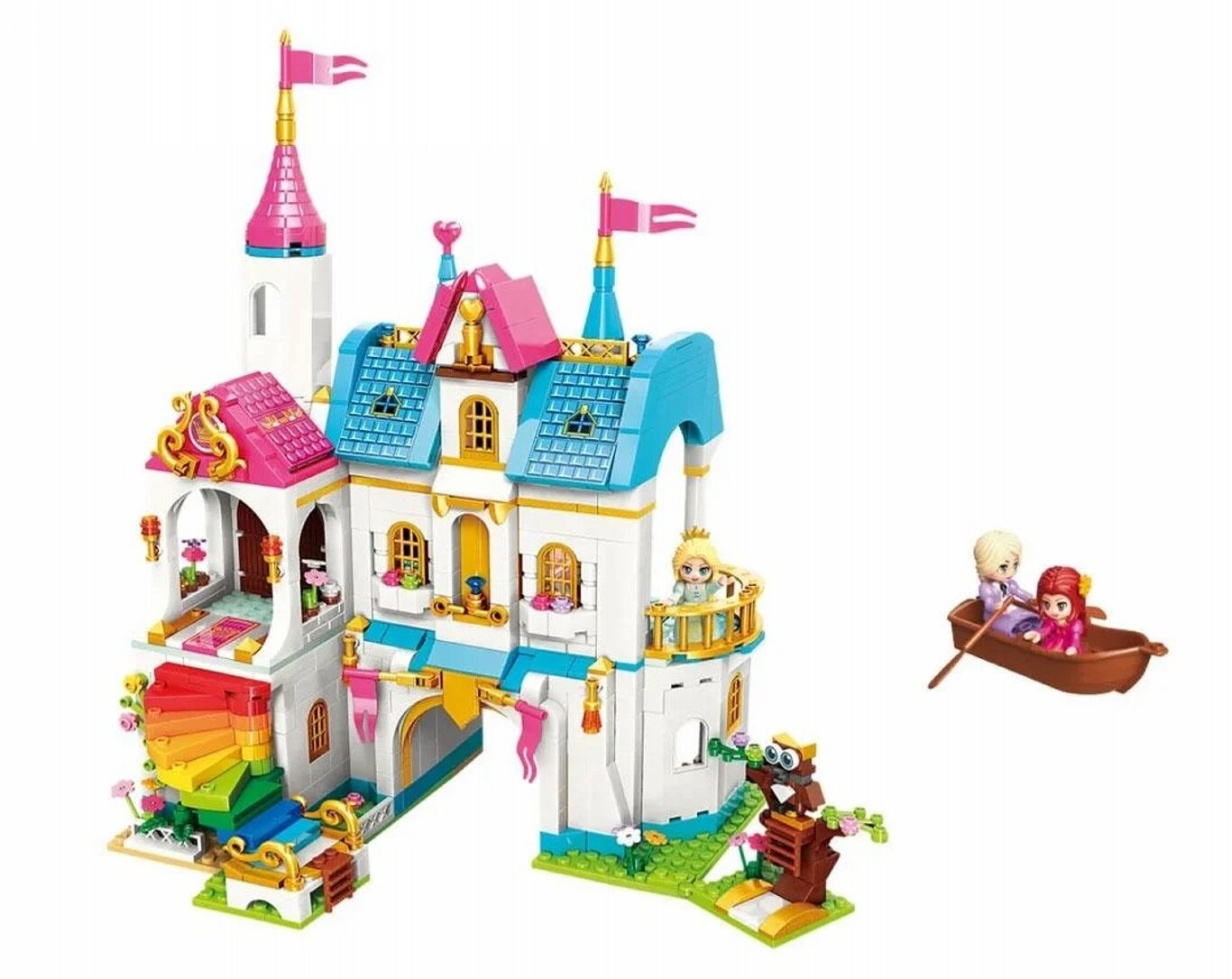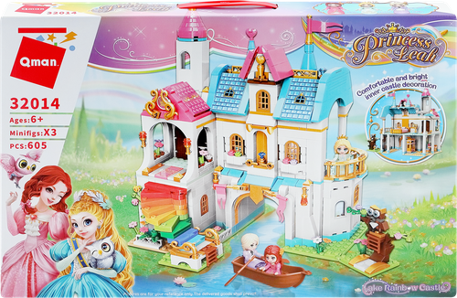 Из пластиковых деталей, входящих в данный набор, маленькая любознайка сможет сконструировать красочный трёхэтажный замок с балконом и башенкой, а также разнообразными аксессуарами, в том числе прогулочной лодкой для катания фигурок.
