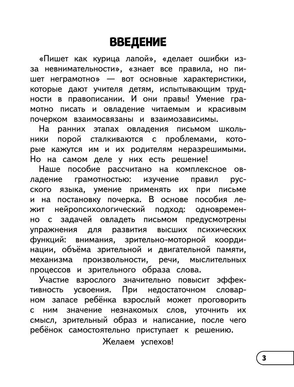 Тренажер для учеников начальной школы подготовлен специалистами-нейропсихологами с учетом возрастных особенностей школьников. Он поможет не только отработать и закрепить навыки письма, отработать основные правила по русскому языку за 1-4 классы, но и развить зрительно-моторную координацию, внимание, память и речь младших школьников. Современное и удобное в использовании пособие полностью соответствует всем требованиям ФГОС начального общего образования.