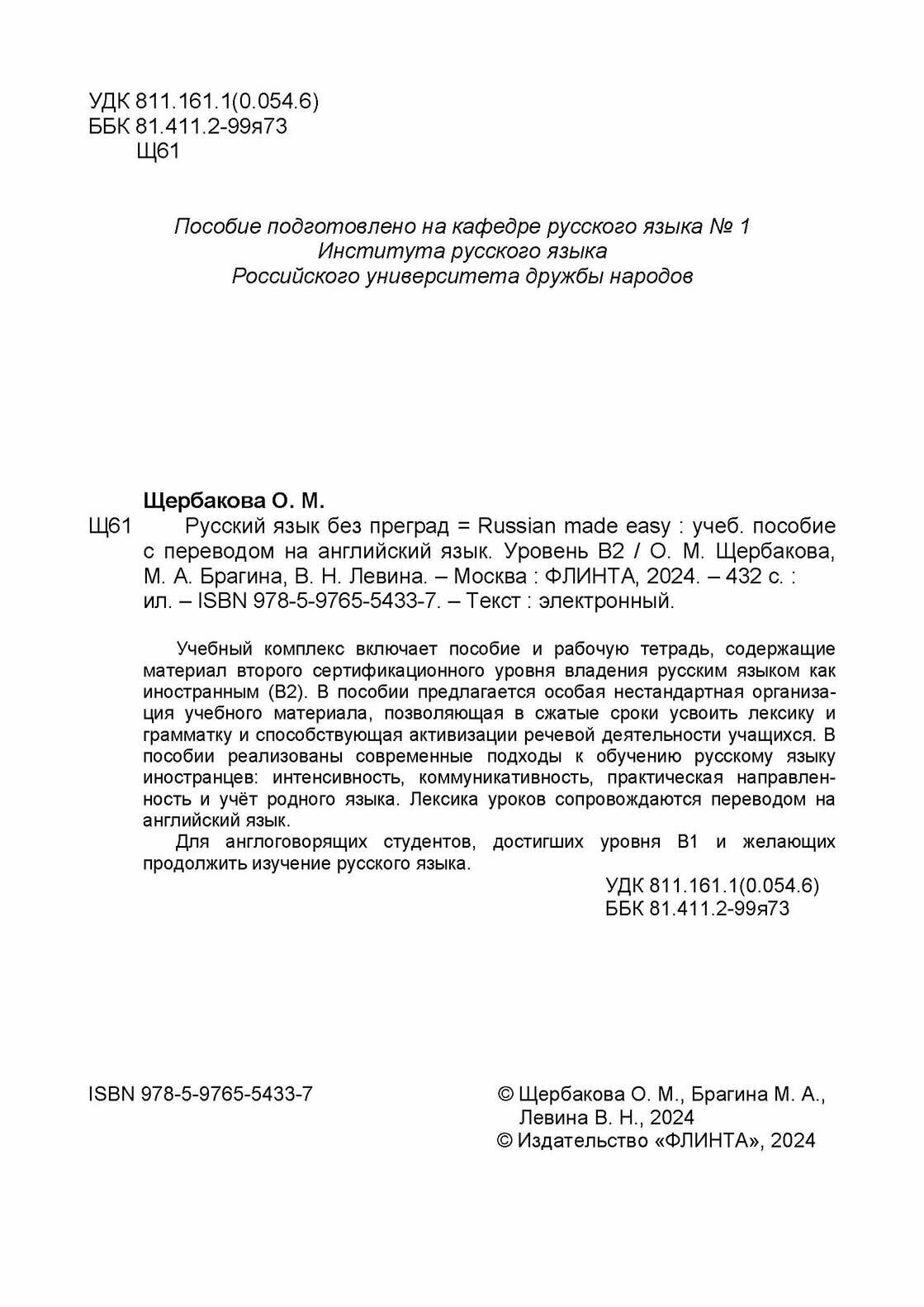 Русский язык без преград. Учебное пособие с переводом на английский язык. Уровень B2 (Щербакова Ольга Маратовна, Брагина Марина Александровна, Левина Вера Николаевна); Флинта, 2024