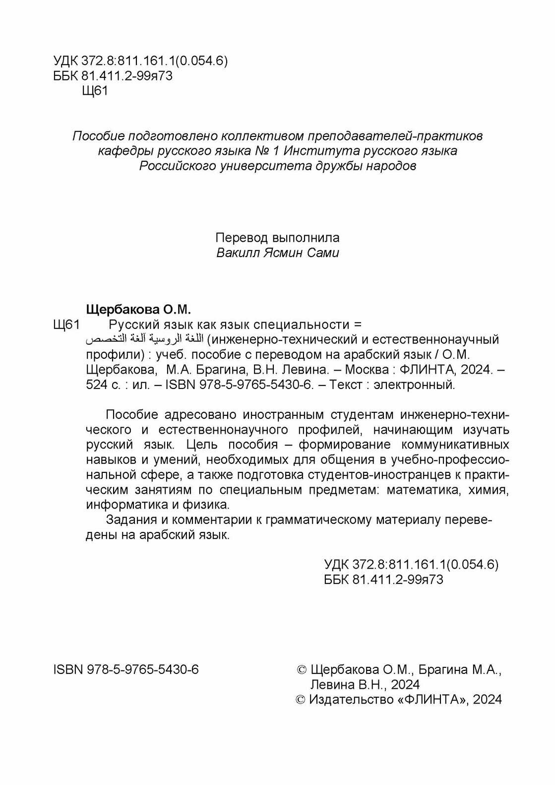 Русский язык как язык специальности. Учебное пособие с переводом на арабский язык (Щербакова Ольга Маратовна, Брагина Марина Александровна, Левина Вера Николаевна); Флинта, 2024