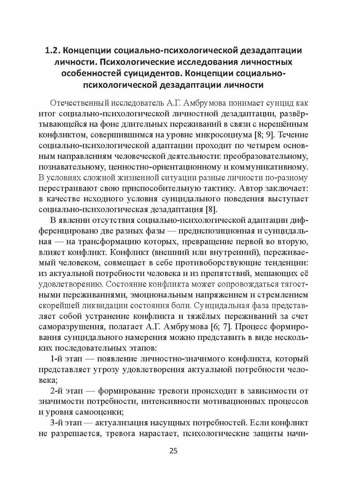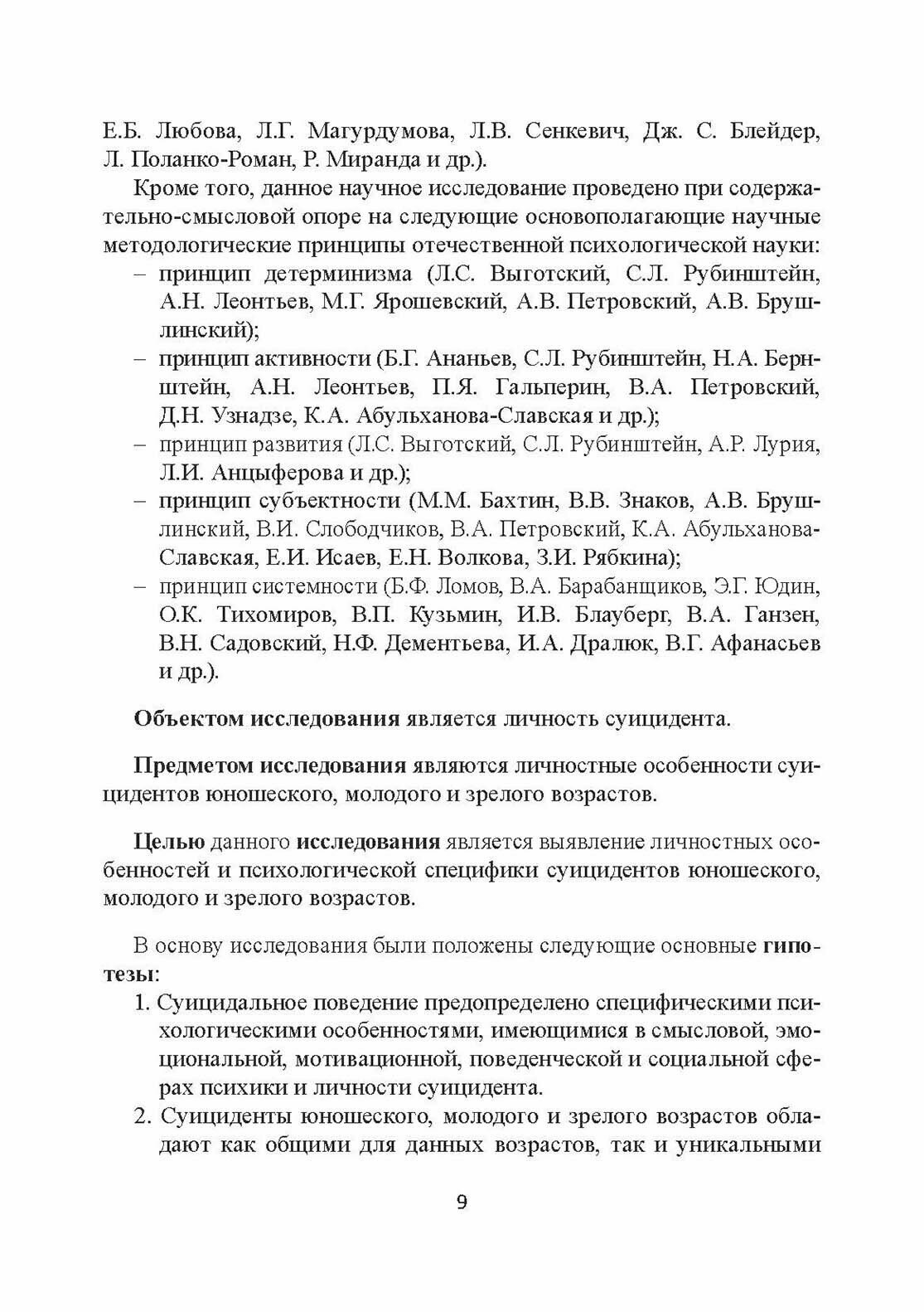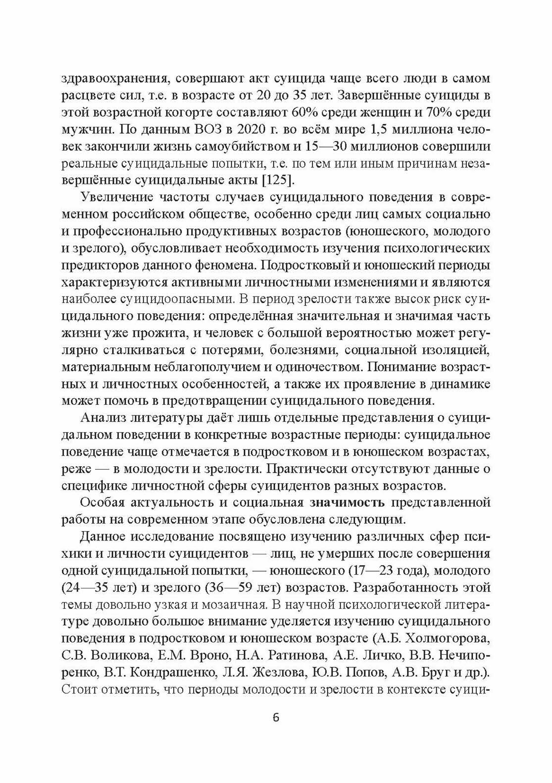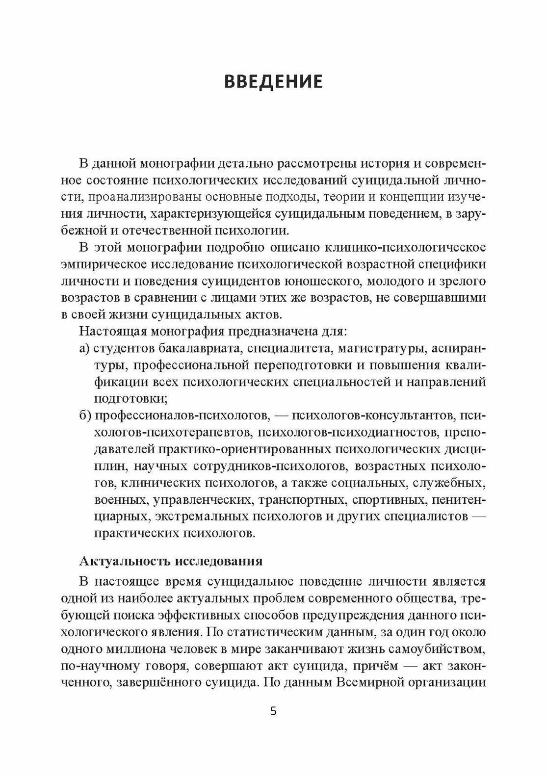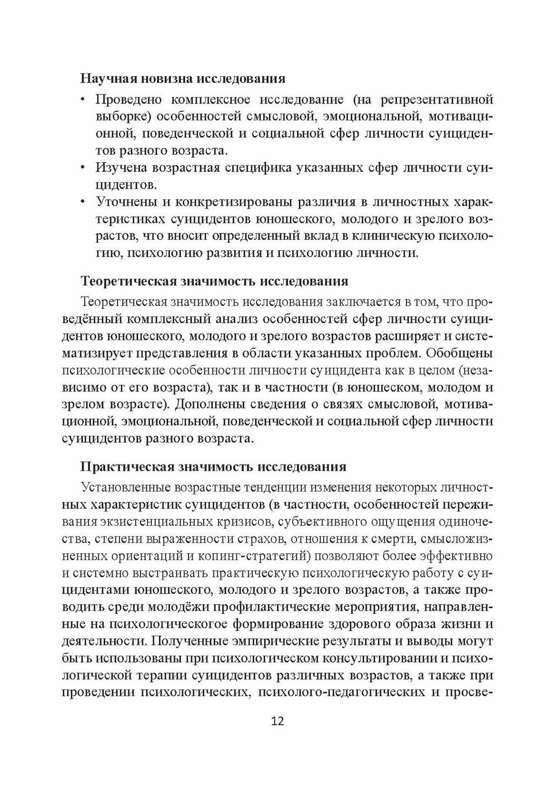 Рассмотрены история и современное состояние психологических исследований суицидальной личности, проанализированы основные подходы, теории и концепции изучения личности, характеризующейся суицидальным поведением, в отечественной и зарубежной психологии. Описано клинико-психологическое эмпирическое исследование психологической возрастной специфики личности и поведения суицидентов юношеского, молодого и зрелого возрастов в сравнении с лицами этих же возрастов, не совершавшими законченных суицидальных попыток.