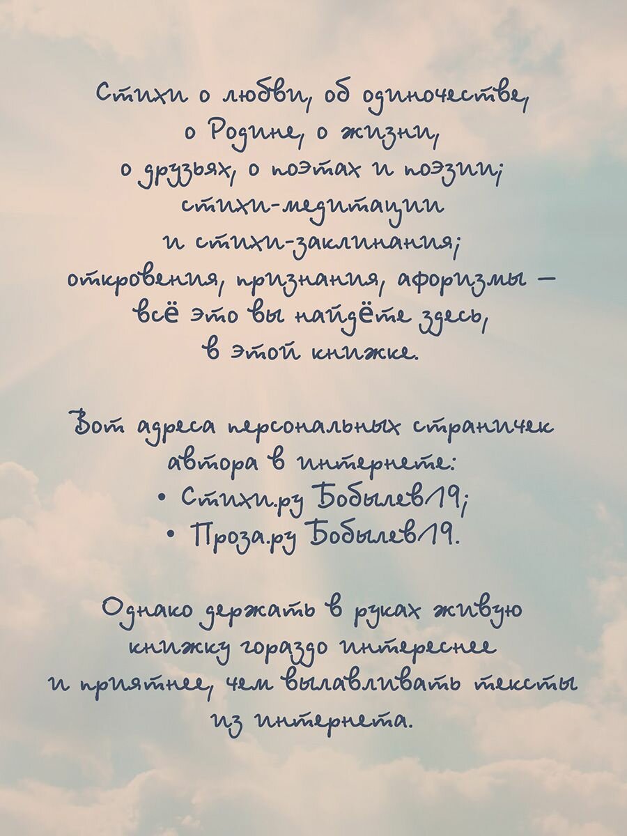 Стихи о любви, об одиночестве, о Родине, о жизни, о друзьях, о поэтах и поэзии; стихи-медитации и стихи-заклинания; откровения, признания, афоризмы - все это вы найдете здесь, в этой книжке.