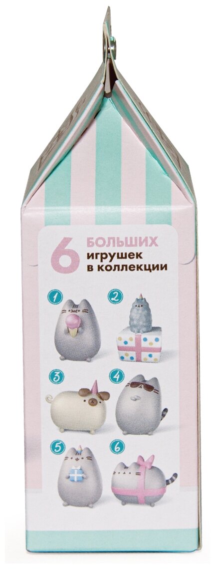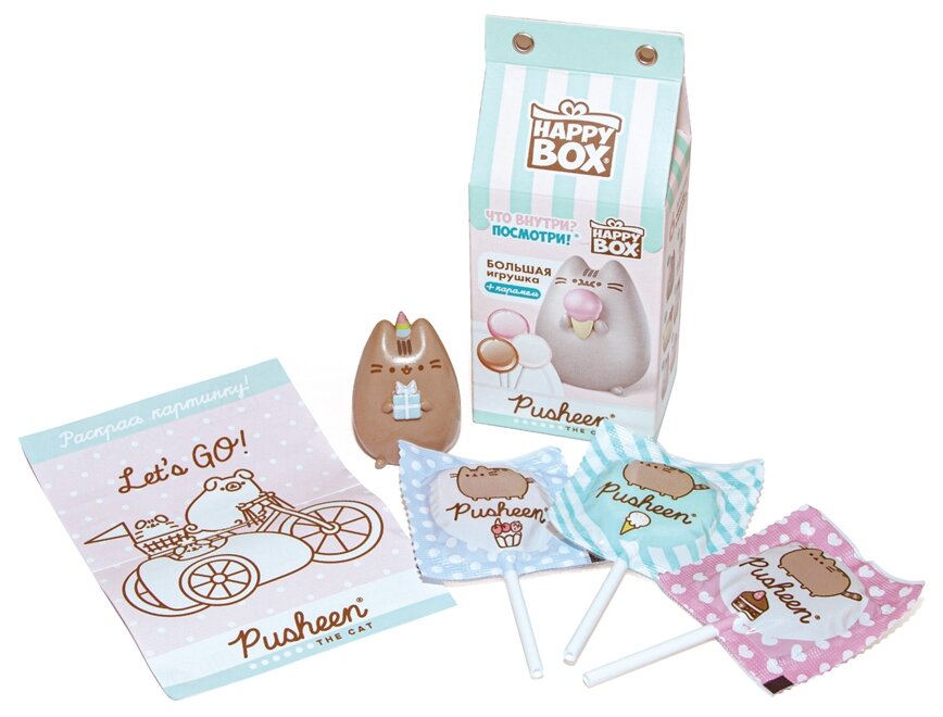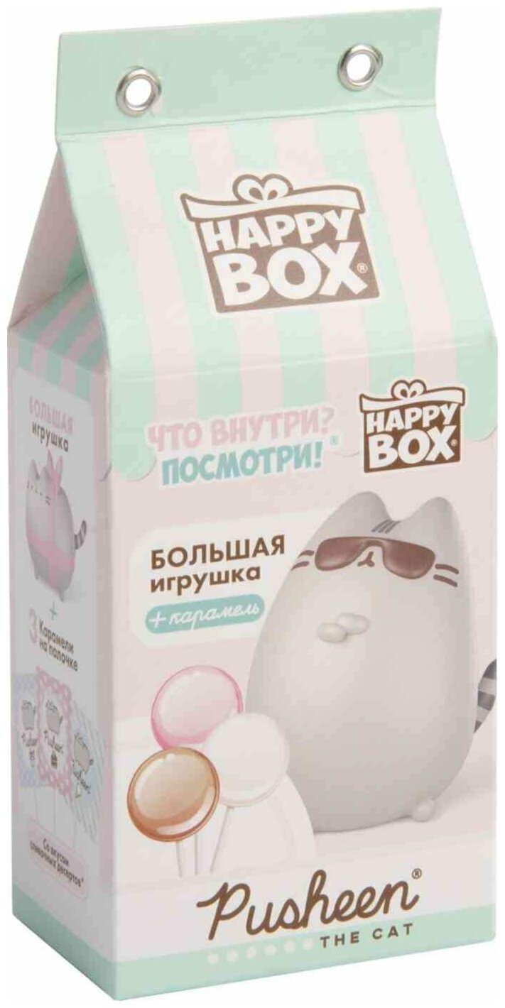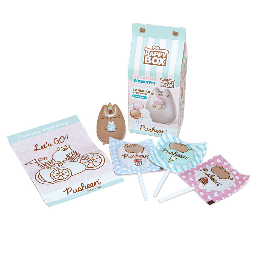 Happy Box Pusheen — уникальный коллекционный набор с коллекцией игрушек в виде любимой всеми кошки Пушин и ее друзей. Коллекция игрушек состоит из 6 классных больших 3D-фигурок. Таких игрушек вы ещё не видели – каждая из них влюбляет в себя с первого взгляда: Пушин с мороженкой, Шторми на подарочной коробке, Пушин в очках и другие. Фигурки из коллекции выполнены из безопасного для ребёнка пластика. Впервые для Happy Box был использован новый формат коробки, которая напоминает пакет молока или домик. Всего в линейке два дизайна упаковки в мятно-розовом цвете. Коробка имеет матовое и приятное на ощупь покрытие. Помимо игрушки, в коробочке Happy Box три плоских леденца на палочке в виде круга со вкусами панна-котты с лесными ягодами, сливочного мороженого и тирамису. Каждый леденец упакован в индивидуальную плёнку с изображением Пушин. Карамель на палочке производится на собственной российской фабрике из натуральных ингредиентов.