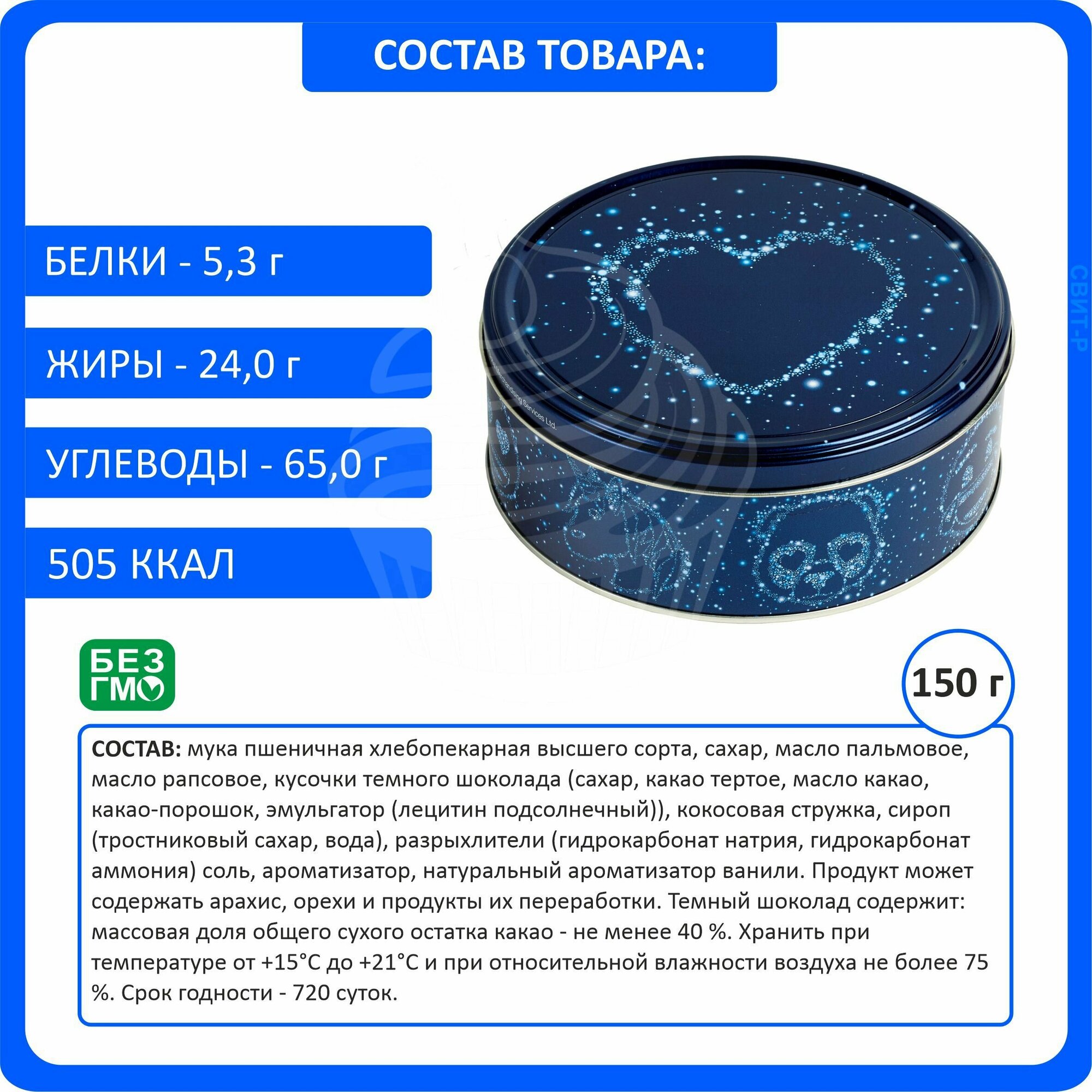 | Состав | Мука пшеничная хлебопекарная высшего сорта, сахар, масло пальмовое, масло рапсовое, кусочки темного шоколада (сахар, какао тертое, масло какао, какао-порошок, эмульгатор (лецитин подсолнечный)), кокосовая стружка, сироп (тростниковый сахар, вода), разрыхлители (гидрокарбонат натрия, гидрокарбонат аммония) соль, ароматизатор, натуральный ароматизатор ванили. Продукт может содержать арахис, орехи и продукты их переработки. Темный шоколад содержит |